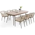 Perfekt für Gartenpartys! Dieses IDIMEX Sunny Set hat alles was du brauchst: 8 bequeme Stühle und einen ausziehbaren Tisch in schickem Champagner. Der Tisch geht von 180cm auf 240cm - ideal wenn mal mehr Gäste kommen. Aus pulverbeschichtetem Aluminium, das rostfrei und wetterfest ist. Die Stühle haben eine stylische Seilbespannung in Beige und wasserabweisende Polyester-Polster - super bequem auch für lange Abende. Alles ist stapelbar, also platzsparend zu verstauen. Leichte Montage nötig, aber mit Anleitung echt einfach. Perfekt für Terrasse, Balkon oder Garten. Die Polster sind abnehmbar und leicht zu reinigen. Einfach ab und zu mit Seifenwasser abwischen und die Möbel halten ewig. Für alle, die gerne draußen sitzen und value auf Qualität und Komfort legen. Dein Garten wird zum Lieblingsplatz!