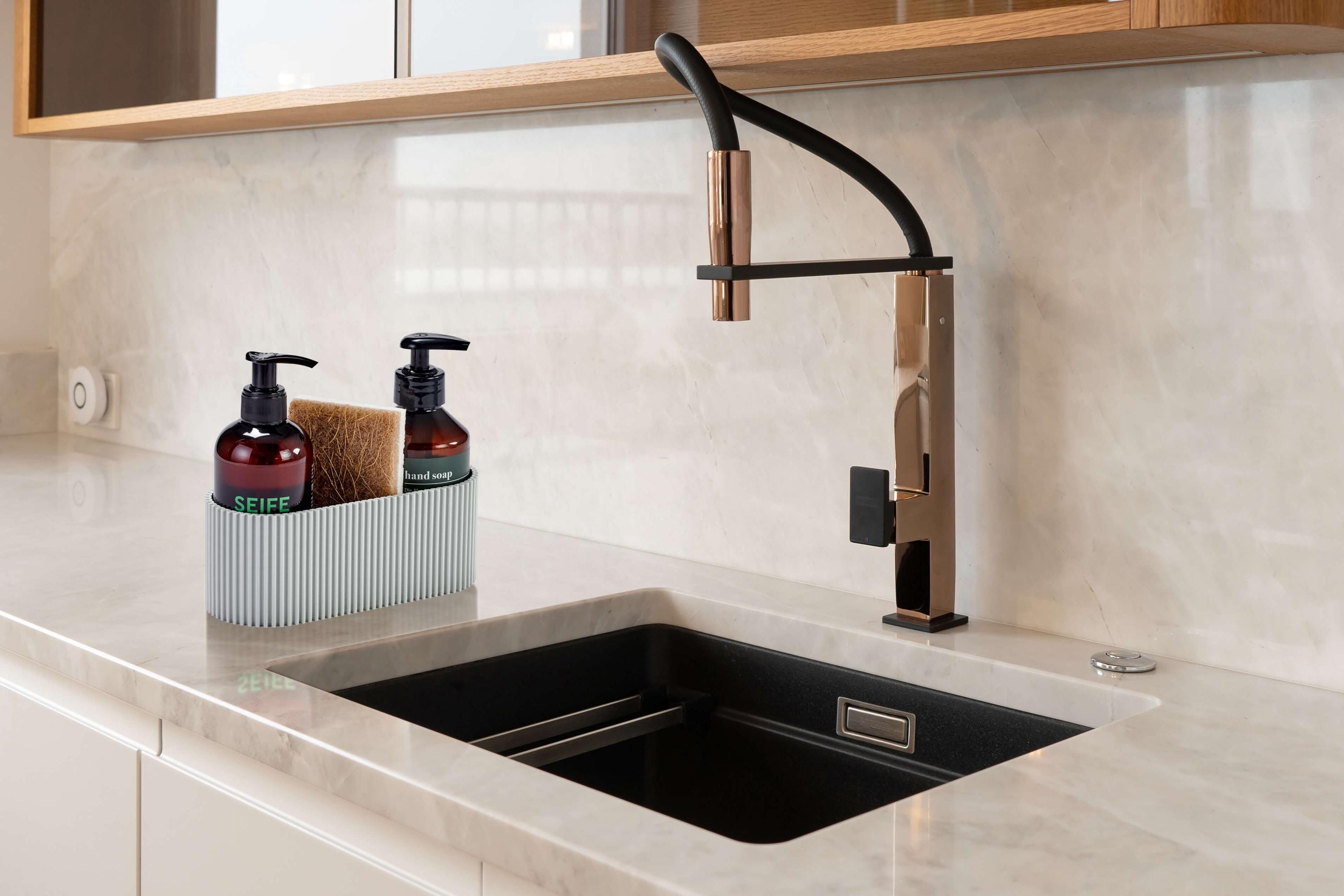 Schluss mit Chaos am Spülbecken! Dieser schwarze Organizer aus Metall bringt Ordnung in deine Küche. Mit 360° drehbarem Ablauf lässt sich das Wasser immer optimal ableiten. Die Maße 24,5x9x13cm passen auch in kleinere Spülbecken. Du kannst ihn einfach aufstellen oder mit dem mitgelieferten Klebepad an der Wand befestigen. Perfekt für Schwämme, Bürsten, Spülmittel und mehr - auch im Badezimmer einsetzbar. Das durchlässige Design sorgt für schnelles Trocknen. Endlich alles griffbereit und ordentlich!