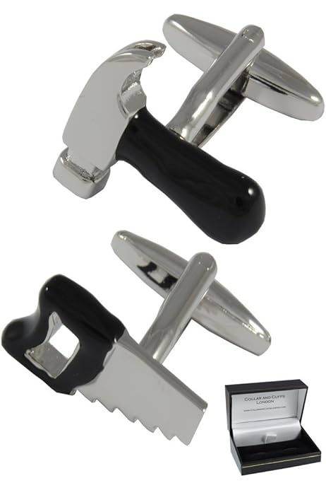 Diese lustigen Manschettenknöpfe mit Hammer und Säge sind perfekt für alle Handwerker und Heimwerker! Aus hochwertigem Messing gefertigt, silberfarben rhodiniert und absolut anlaufgeschützt. Mit ca. 2 cm Länge sind sie ein dezenter aber wirkungsvoller Blickfang. Die hochwertige Mechanik sorgt für sicheren Halt an deiner Hemdsmanschette. Perfekt für Handwerker, die auch im eleganten Outfit ihren Beruf nicht verleugnen wollen. Wird in einer schönen Geschenkbox geliefert - ideal als Mitbringsel oder Geburtstagsgeschenk. Mach dein Business-Outfit mit diesem persönlichen Touch komplett!