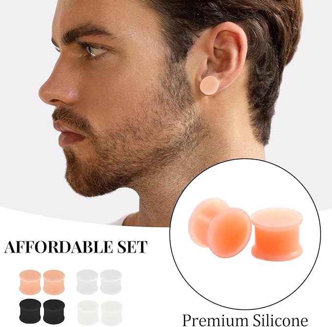 Maximaler Komfort für deine gedehnten Ohrläppchen! Dieses Set mit 4 Paar Silikon Flesh Tunnels ist perfekt für alle, die es bequem mögen. Die Tunnel aus hochwertigem, elastischem Silikon sind superweich, leicht und super bequem zu tragen. Mit dem Double-Flared-Design lassen sie sich einfach einsetzen und entfernen - kein Gedrücke mehr! Erhältlich in verschiedenen Größen von 6mm bis 20mm, damit für jedes Ohrloch der passende Tunnel dabei ist. Das leichte Material verhindert ein unangenehmes Zuggefühl und ist hypoallergen - perfekt für empfindliche Ohren. Die verschiedenen Farben im Set geben dir viele Styling-Optionen für jeden Tag. Ob für Party, Festival, Hochzeit oder einfach nur so - diese Tunnel passen zu jedem Outfit. Ein ideales Geschenk für Piercing-Fans oder einfach mal was Neues für dich selbst. Einfach reinigen und tragen - so einfach geht's! Endlich Ohrschmuck, der sich fast unsichtbar anfühlt aber trotzdem richtig was hermacht.