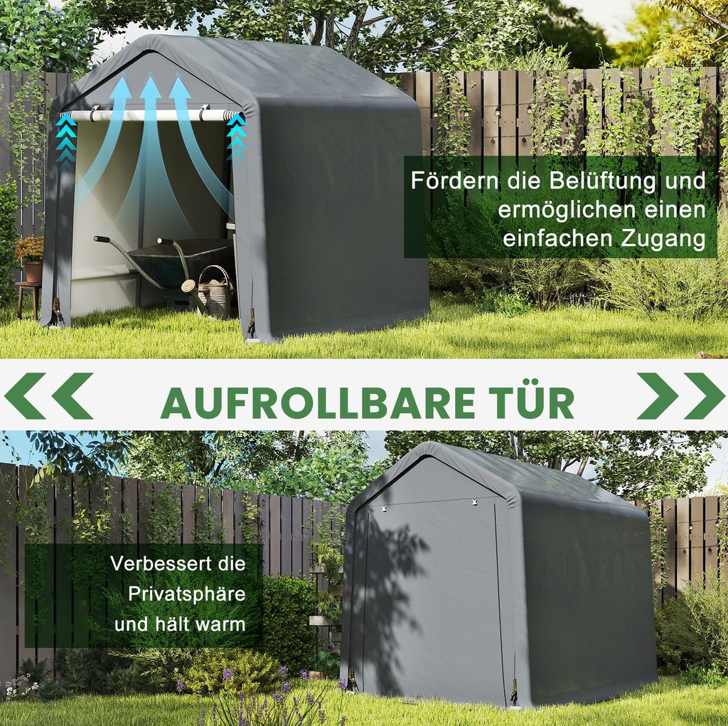 Endlich praktischer Stauraum für deinen Garten! Dieses COSTWAY Garagenzelt mit 160x218x164cm (LxBxH) bietet jede Menge Platz für Fahrräder, Motorräder, Gartengeräte oder Brennholz. Der stabile Rahmen aus verzinkten Stahlrohren rostet nicht und hält auch bei Wind und Wetter stand. Die 170G PE-Abdeckung ist komplett wasserdicht und schützt deine Sachen vor Regen, Schnee und Staub. Mitgeliefert werden U-förmige und L-förmige Erdspieße plus Windseile für extra Stabilität - wichtig bei starkem Wind! Die aufrollbare Reißverschlusstür (127x122cm) macht den Zugang super einfach und sorgt für gute Belüftung. Montage ist kein Problem: nummerierte Teile und Schraubverbindungen ohne Werkzeug. Perfekt für Garten, Hof, Terrasse oder Poolbereich. Ein echter Allrounder, der deine Geräte trocken und sicher lagert. Tipp: Bei Schnee einfach das Dach regelmäßig abfegen, dann hält das Zelt ewig!
