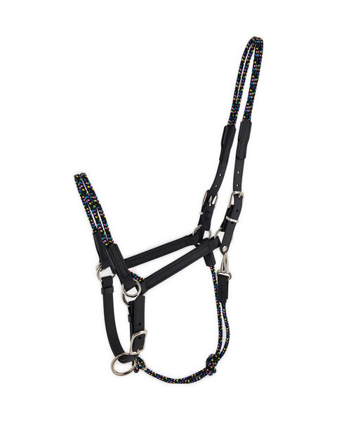 Perfekt für die Arbeit mit deinem Pony! Dieses WALDHAUSEN Knotenhalfter in tolllem Tannengrün ist vielseitig einsetzbar für Bodenarbeit oder auch zum Reiten. Mit praktischen Ringen zum Einhaken der Zügel. Die 3,15m langen Zügel sind mit Snap-Karabinern abnehmbar - super praktisch! In Größe PON für die meisten Ponys geeignet. Wichtig: Nicht zum Anbinden des Pferdes geeignet! Für sicheres und effektives Training mit deinem Vierbeiner. Hol dir dieses qualitative Halfter und mach das nächste Training zum Erfolg!