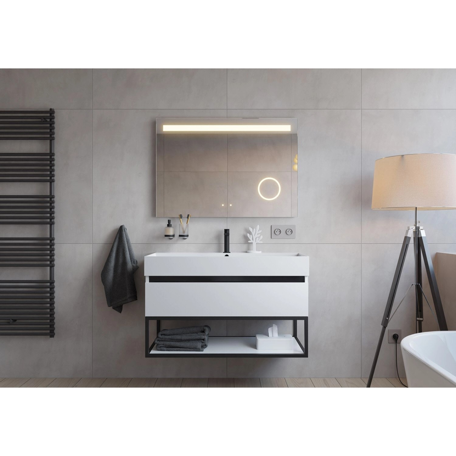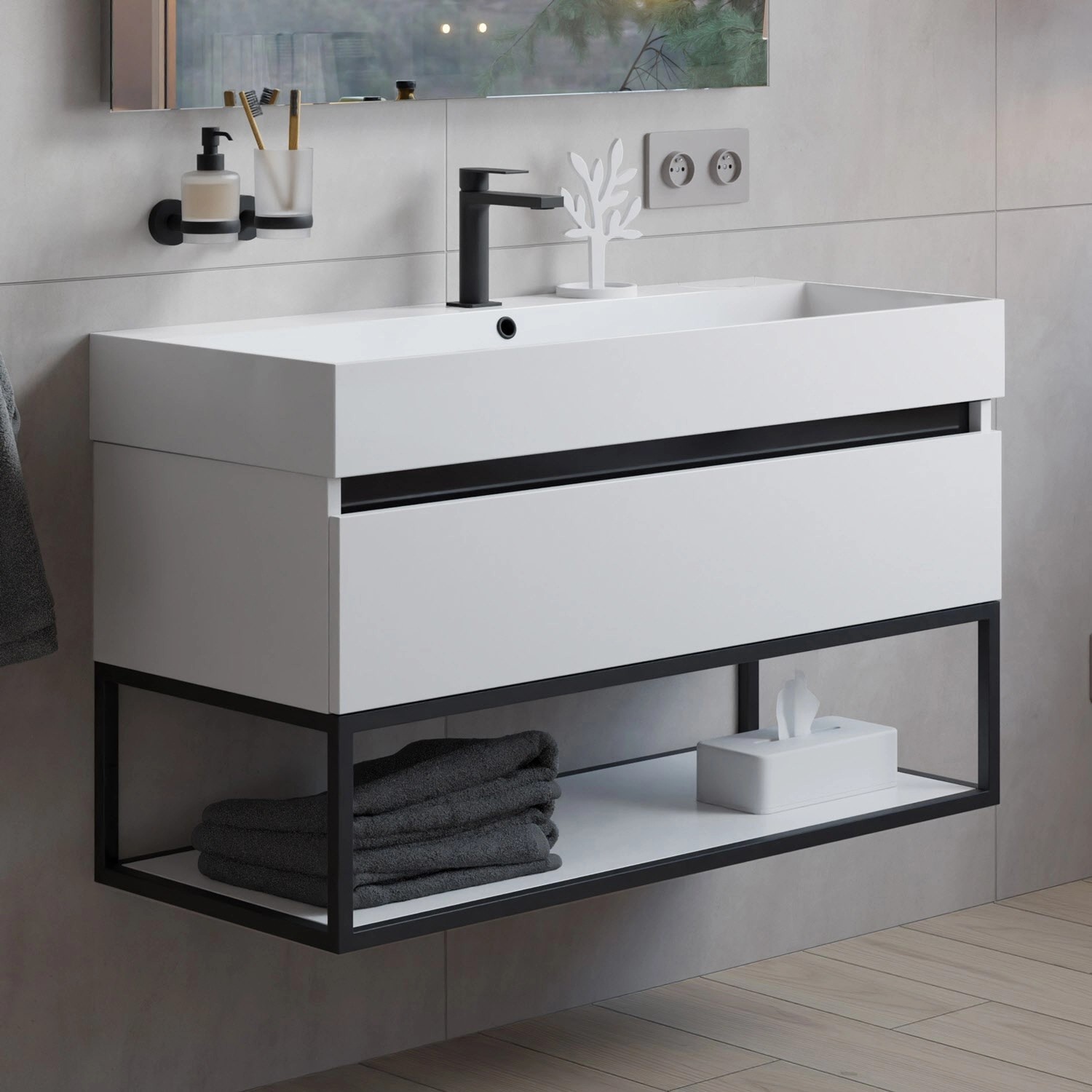 Das BERNSTEIN Ava Badmöbel-Set bringt modernen Style in dein Badezimmer! Mit 100cm Breite ideal für mittelgroße Bäder. Das Mineralguss-Waschbecken in Cremeweiß matt ist robust und pflegeleicht. Der Unterschrank in Weiß matt mit anthrazitfarbenem Innenraum bietet stylischen Stauraum. Hochwertige Hettich Schubladen mit Soft-Close-Funktion - kein lästiges Knallen mehr! Feuchtigkeitsresistente Materialien halten auch bei hoher Luftfeuchtigkeit stand. Nachhaltig produziert mit reduzierter Verpackung. Ohne Hahnloch - du kannst den Wasserhahn frei positionieren. Schafft eine hochwertige Atmosphäre und macht jedes Bad zum Wohlfühlraum. Einfach montieren und jahrelang Freude haben!
