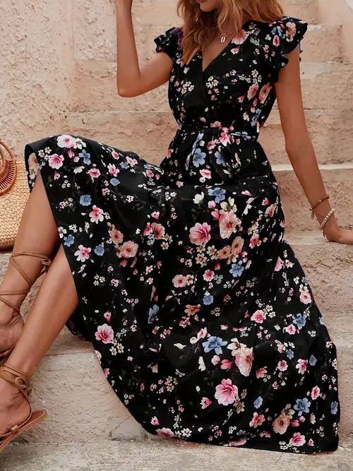 Damen Maxikleid Sommer - Blumendruck Mit Rüschensaum & V-Ausschnitt