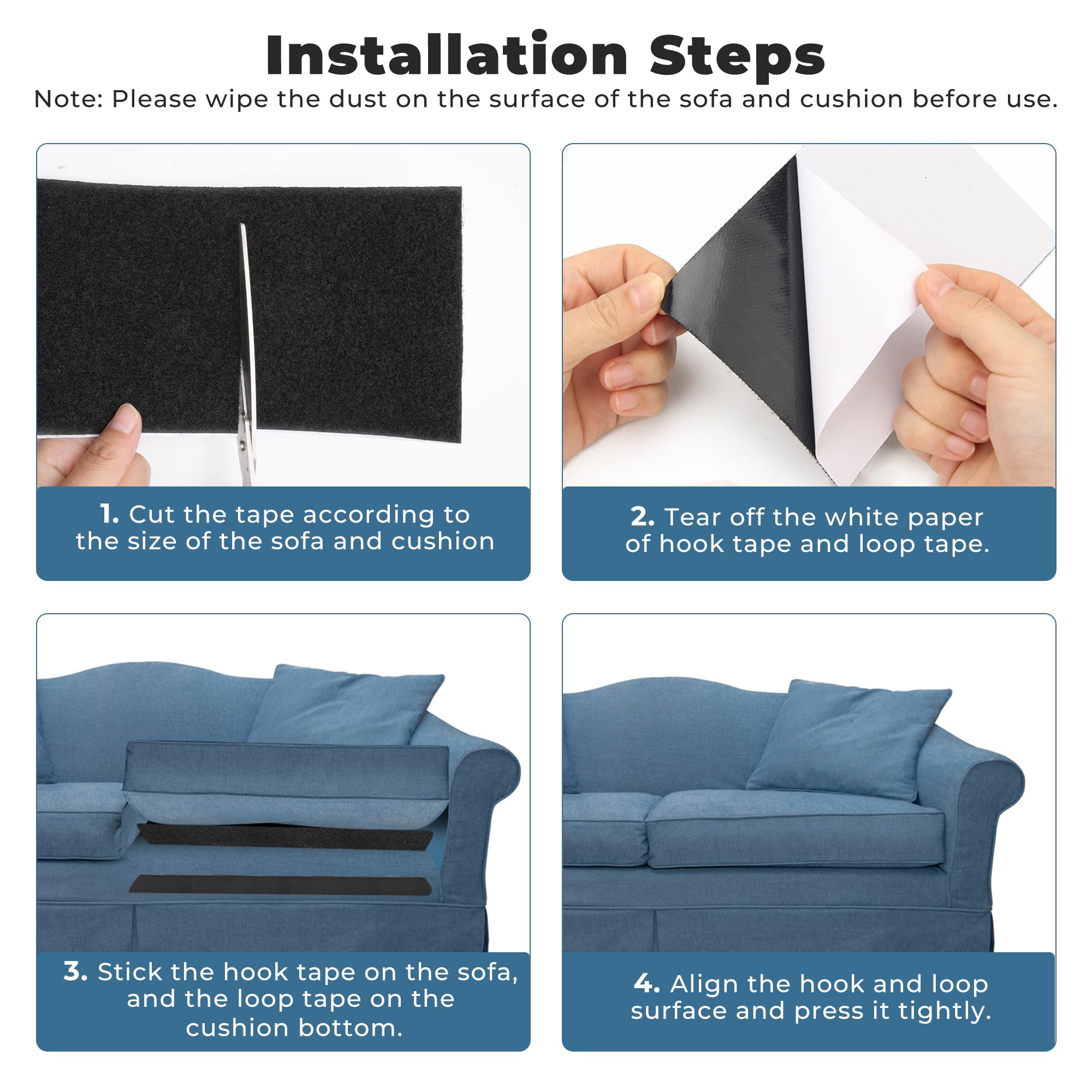 Endlich rutschfeste Sofakissen! Dieses 6er-Set Klettbänder in der Größe 15x15 cm löst dein Rutschproblem im Handumdrehen. Aus ultrastarkem Nylon und Polyester gefertigt, halten die Bänder auch bei intensiver Nutzung zuverlässig. Die selbstklebende Rückseite haftet fest auf den meisten Oberflächen und lässt sich dennoch rückstandslos entfernen. Einfach die weiße Folie abziehen, auf Sofa und Kissen kleben, zusammendrücken - fertig! Aber nicht nur für Sofakissen geeignet: Du kannst die Bänder zuschneiden und für Fotorahmen, Fernbedienungen, Stühle, Matratzen oder Teppiche verwenden. Eine perfekte Alternative zu Nägeln, Schrauben oder klebrigem Klebeband. Ohne Werkzeug, ohne Bohren, ohne Schmutz - einfach praktisch!