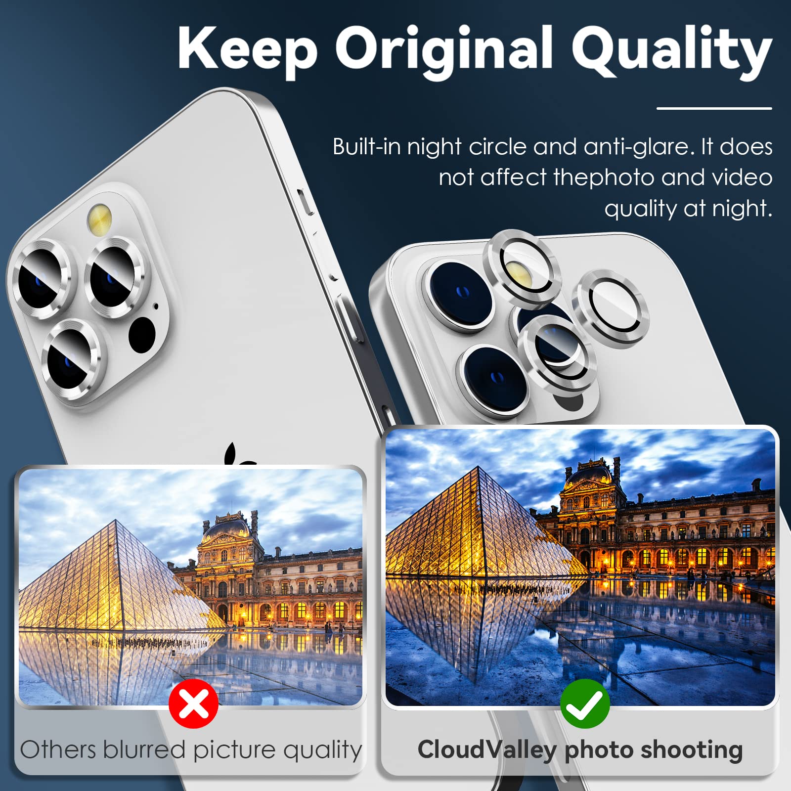 Schütze die teure Kamera deines neuen iPhone 17 Pro Max! Dieser CloudValley Objektivschutz aus temperiertem Glas mit 9H Härte bewahrt deine Linsen vor Kratzern von Schlüsseln, Münzen und anderen scharfen Gegenständen. Die Doppel-AR+AF-Schicht verhindert lästige Blendungen und sorgt für kristallklare Fotos - selbst bei Nachtaufnahmen mit Blitz. Das leuchtende Silber-Design sieht nicht nur stylisch aus, sondern reflektiert das Licht wunderschön. Einfach anzubringen - ohne Werkzeuge! Der starke Klebstoff hält sicher, ohne Rückstände zu hinterlassen. Kompatibel mit den meisten Handyhüllen. Hol dir diesen Schutz und mach deine iPhone-Kamera unverwundbar!