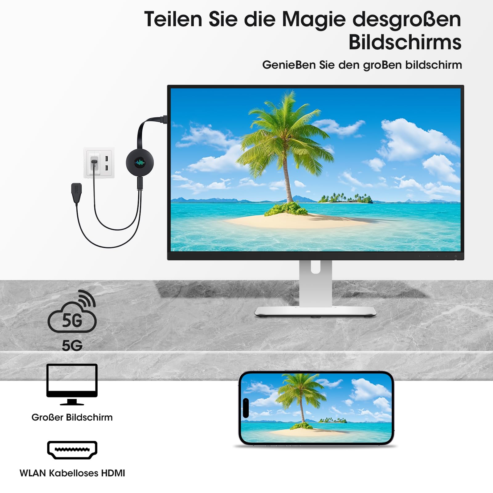 Endlich kabellos streamen! Dieser Wireless HDMI Dongle überträgt Bild und Ton von deinem Smartphone, Laptop oder Tablet direkt auf den TV, Beamer oder Monitor. Unterstützt 4K Ultra HD Eingang und optimiert auf butterweiches 1080p Streaming. Mit Dual-Band WLAN (2,4G/5G) für stabile Verbindung bis 20 Meter Reichweite. Kompatibel mit Android, iOS, Windows und Mac - unterstützt Miracast, AirPlay und DLNA. Einfach Plug & Play: HDMI und USB anschließen, verbinden und losstreamen! Keine Apps oder Software nötig. Perfekt für Filme, Präsentationen, Gaming oder Fotos. Achtung: Nicht kompatibel mit DRM-geschützten Inhalten wie Netflix. Im Lieferumfang: Dongle, HDMI-Kabel, USB-Kabel und Anleitung. 24 Monate Garantie inklusive!