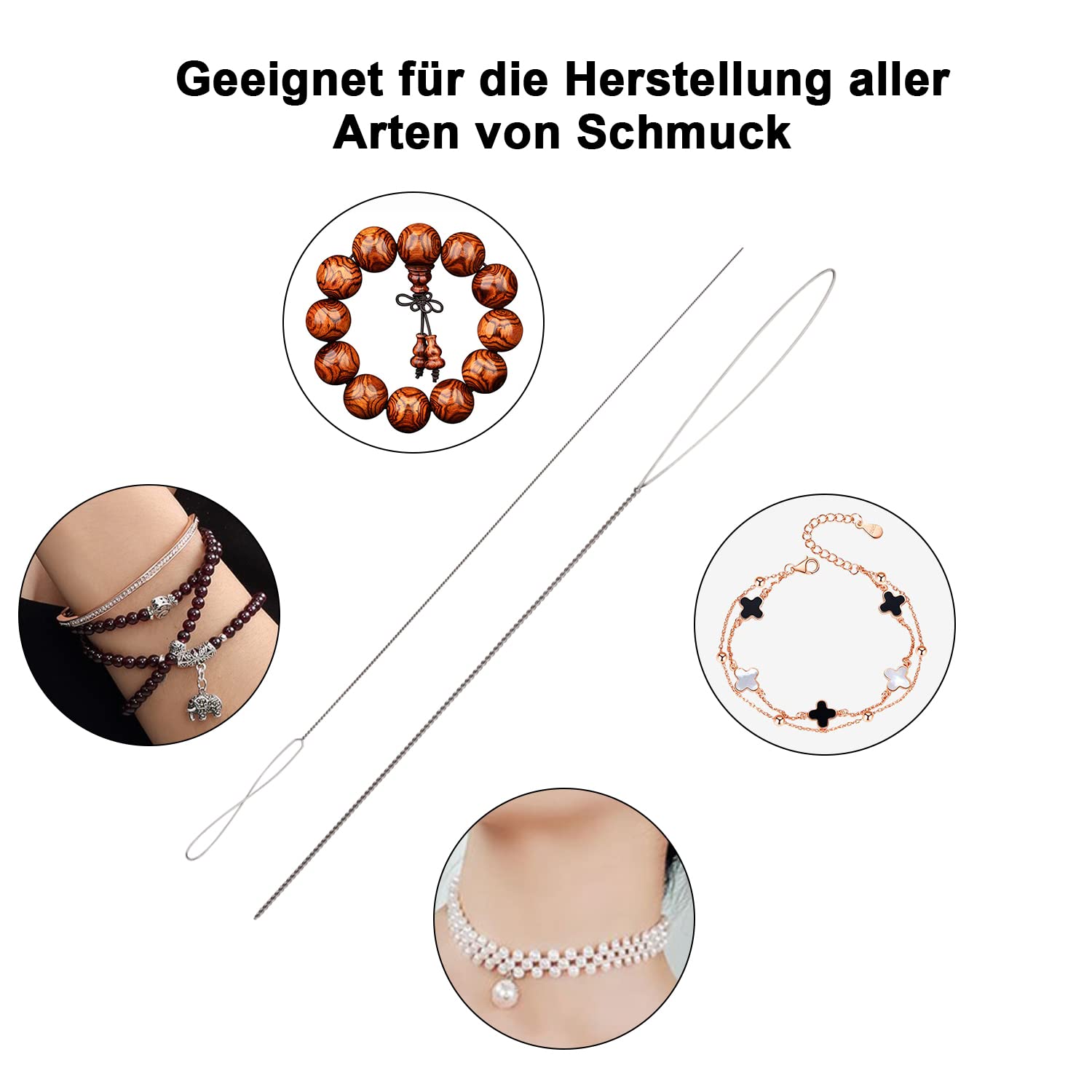 Perlenfädeln war noch nie so einfach! Dieses 42-teilige Set hat alles, was du für deine Schmuckprojekte brauchst. 12 Nadeln mit großen Öffnungen in 6 verschiedenen Größen (von 4,5 cm bis 12,7 cm) und 24 lange, gerade Nadeln in 4 Größen (55 mm bis 120 mm). Egal ob große Holzperlen oder winzige Glasperlen - hier findest du die passende Nadel! Aus hochwertigem Metall, das sich nicht verbiegt oder bricht. Super praktisch: Drei Nadeleinfädler machen das Fädeln zum Kinderspiel. Zwei Aufbewahrungsfläschchen halten alles ordentlich und griffbereit. Und der Fingerhut schützt deine Hände vor Stichen. Perfekt für Halsketten, Armbänder, Ohrringe oder andere kreative Projekte. Alles in silberner Ausführung - schick und funktional. Ob Anfänger oder Profi - mit diesem Set machst du garantiert nichts falsch. Deine Schmuckkreationen warten darauf, endlich realisiert zu werden! Fang an zu fädeln und lass deiner Kreativität freien Lauf - das Ergebnis wird dich begeistern!