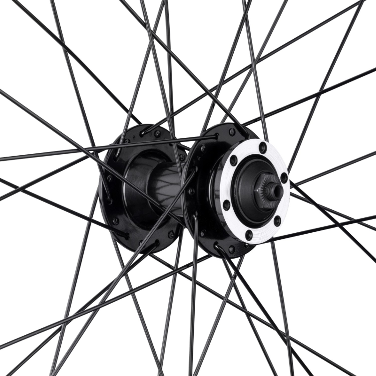 Die 36 Edelstahl-Speichen geben dem Rad mega Stabilität, selbst bei ruppigstem Gelände. Die doppelwandige Felge in Mattschwarz sieht nicht nur cool aus, sondern hält auch was aus. Perfekt für MTBs und E-MTBs mit 100 mm Einbaumaß.