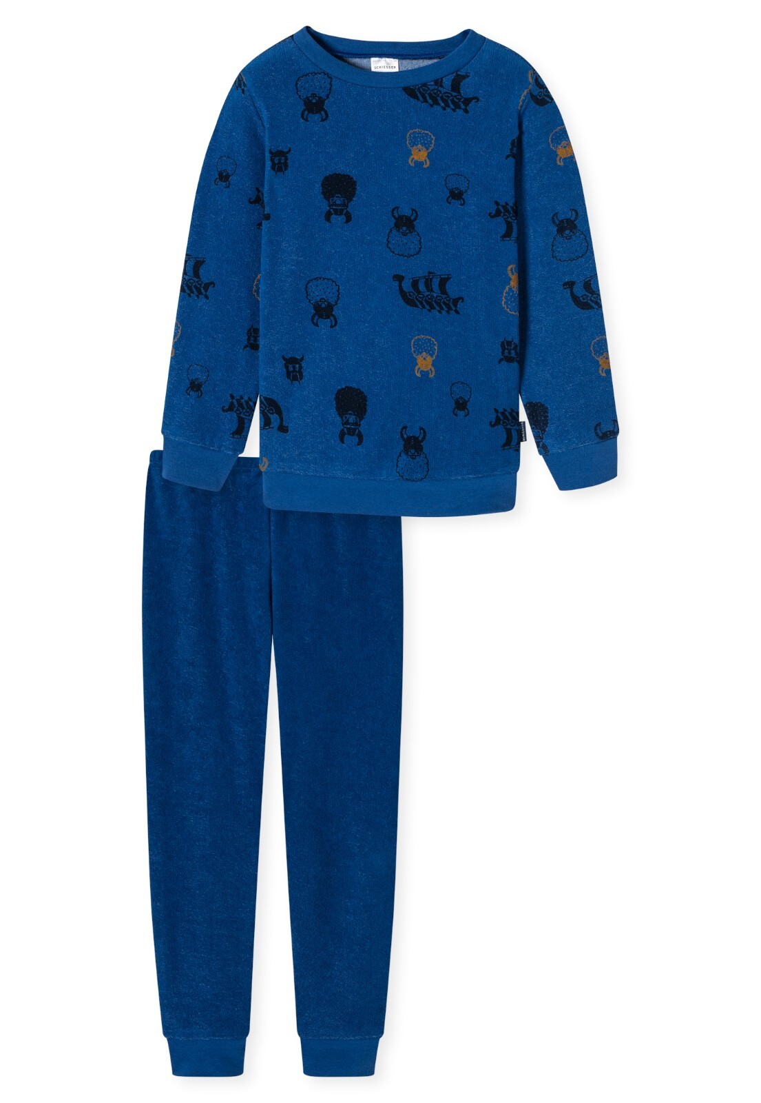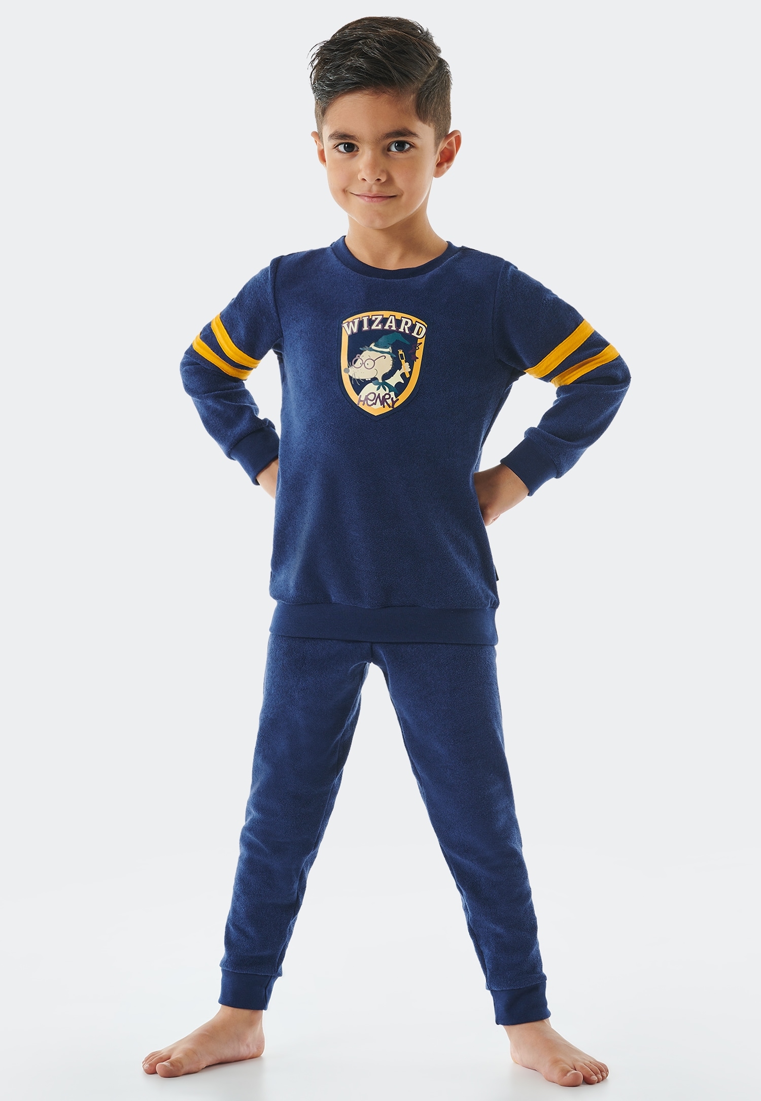 Total kuschelig und mega cool - der SCHIESSER Schlafanzug mit Rat Henry! Der dunkelblaue Frottee-Stoff ist super weich und hält an kalten Abenden richtig schön warm. Das coole Design mit den gelben Ringen und dem Rat Henry-Patch sieht einfach klasse aus - der kleine Trommler gibt den Ton an für süße Träume. Die hochwertigen Arm- und Beinbündchen sorgen dafür, dass nichts zwickt oder drückt. Perfekt für gemütliche Filmabende, Übernachtungen bei Freunden oder einfach zum Wohlfühlen nach einem langen Tag. In bester SCHIESSER-Qualität - hält auch häufiges Waschen problemlos aus. Dein Kind wird diesen Pyjama lieben und nicht mehr ausziehen wollen! Einfach anziehen, ins Bett kuscheln und von musizierenden Ratten träumen. Der absolute Lieblings-Schlafanzug für kleine Abenteurer!