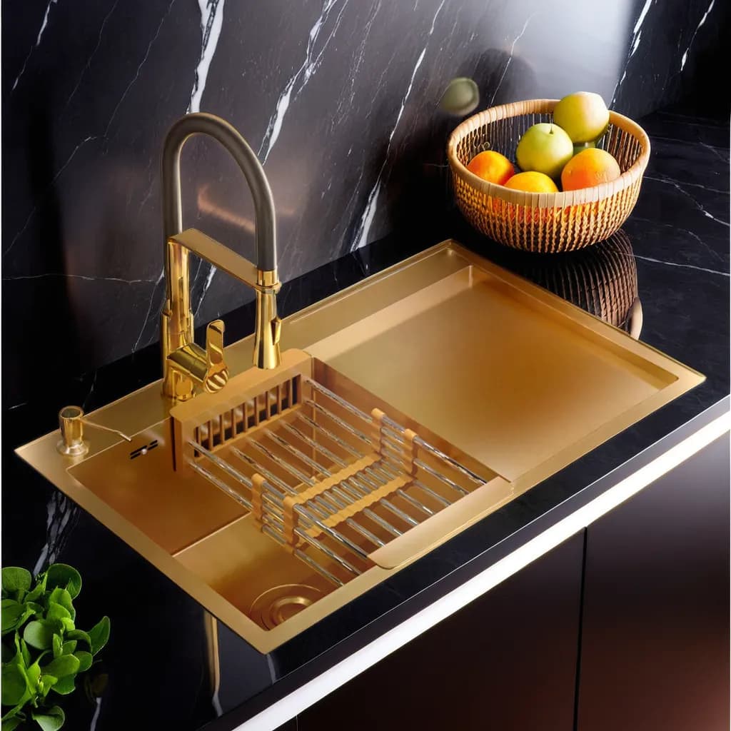 Küchen-Träume in Gold! Diese wunderschöne Einbau-Spüle verwandelt deine Küche in einen echten Blickfang. Mit 78x50cm Maßen und der edlen Gold-Optik macht sie einfach was her!