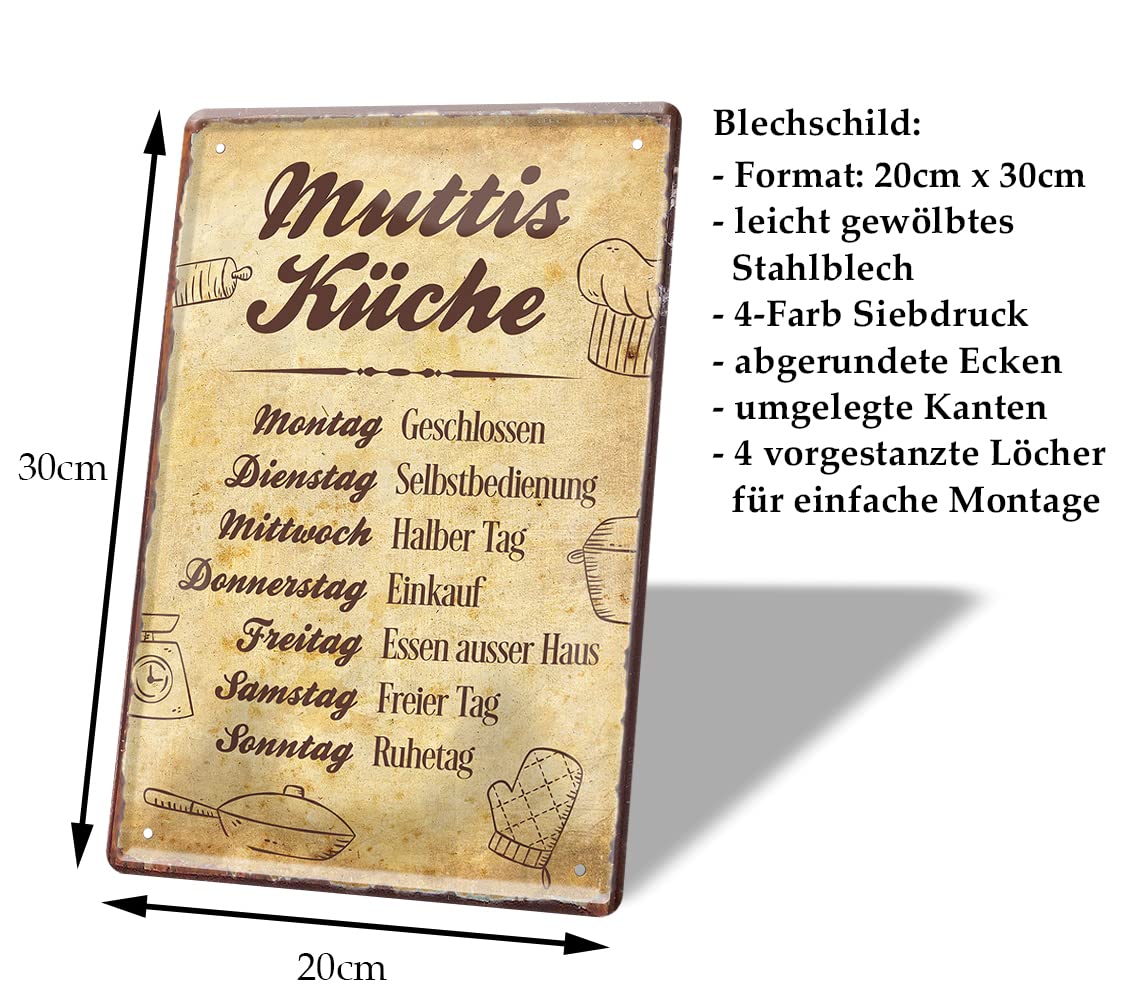 Dieses urige Holzschild bringt Charme und Humor in deine Küche! Das 30x40cm große Schild aus stabilem MDF-Holz zeigt die 'Öffnungszeiten von Muttis Küche' mit liebevollen Illustrationen im Retro-Design. Perfekt für alle, die nostalgischen Charme und einen Augenzwinkern im Alltag mögen. Inklusive Aufhängevorrichtung und 2 Holzdübeln zum Aufstellen. Moderne UV-Drucktechnologie sorgt für kräftige, langlebige Farben. Made in Germany - deutsche Qualität vom Feinsten. Ein ideales Geschenk für Kochbegeisterte oder zur Verschönerung der eigenen Küche. Mach deine Küche zum gemütlichsten Raum im Haus!