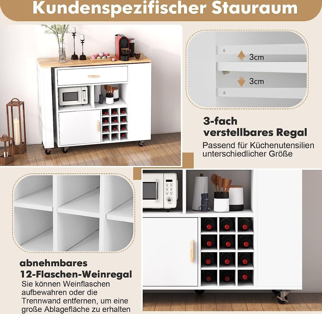 Dieser vielseitige 2-in-1 Küchenwagen von GIANTEX ist der absolute Allrounder für deine Küche! Mit 120x40x100 cm bietet er nicht nur reichlich Arbeitsfläche, sondern verwandelt sich durch die drehbare Tischplatte mühelos in einen länglichen oder L-förmigen Bartisch. Die 7 leisen Rollen (3 mit Bremsen) machen ihn super mobil und stabil. Besonders praktisch: Das integrierte Weinregal bietet Platz für bis zu 12 Flaschen! Dazu kommen eine große Schublade, offene Fächer und Seitenregale für optimale Organisation. Die Arbeitsplatte aus massivem Gummiholz ist wasserfest und langlebig, während die robusten MDF-Platten für Stabilität sorgen. Mit einer Tragfähigkeit von 40 kg auf der Arbeitsplatte und 10 kg in der Schublade meistert dieser Küchenwagen alle Anforderungen. Perfekt für kleine Küchen oder als zusätzliche Arbeitsfläche - stylisch in Weiß/Natur oder Schwarz/Natur erhältlich. Ein echter Hingucker, der Ordnung und Funktionalität vereint!