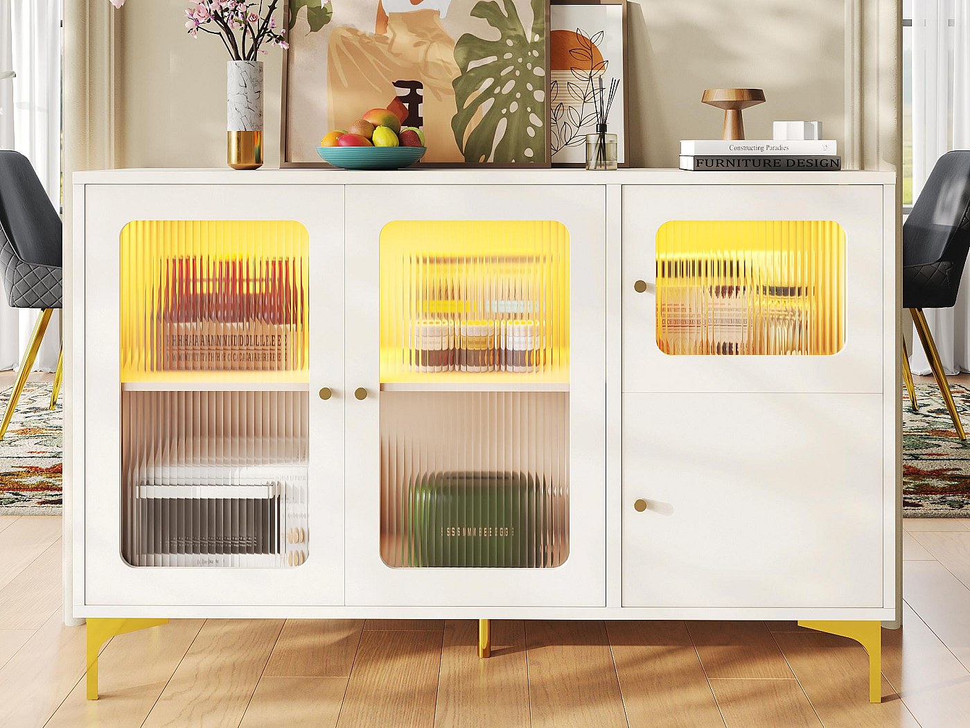 Dieser wunderschöne Küchenschrank kombiniert retro Style mit moderner Technik! In elegantem Grün mit braunen Glastüren sieht er einfach klasse aus. Mit 120x40x179cm bietet er jede Menge Stauraum: Oben Vitrinenfächer mit verstellbaren Einlegeböden hinter braunem Glas, in der Mitte offenes Fach für Kaffeemaschine oder Deko, unten geschlossene Schränke und Schubladen. Das Highlight: Die integrierte LED-Beleuchtung in der Mitte lässt sich per Smartphone-App steuern - sogar mit Musik synchronisierbar! Verstellbare Füße sorgen für stabilen Stand auf unebenem Boden. Aus robustem MDF und PB gefertigt, trägt bis zu 60kg. Montage in ca. 45 Minuten - und schon hast du einen echten Hingucker in deiner Küche oder Wohnung. Retro-Charme meets Smart-Home - einfach genial!