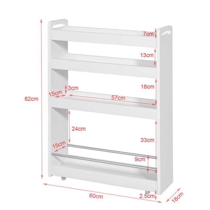 Die Maße von 47,5x13x80,5cm sind ideal für Nischen neben dem Kühlschrank, in der Dusche oder im Flur. Mit dem praktischen Griff kannst du ihn einfach durch die Wohnung schieben.