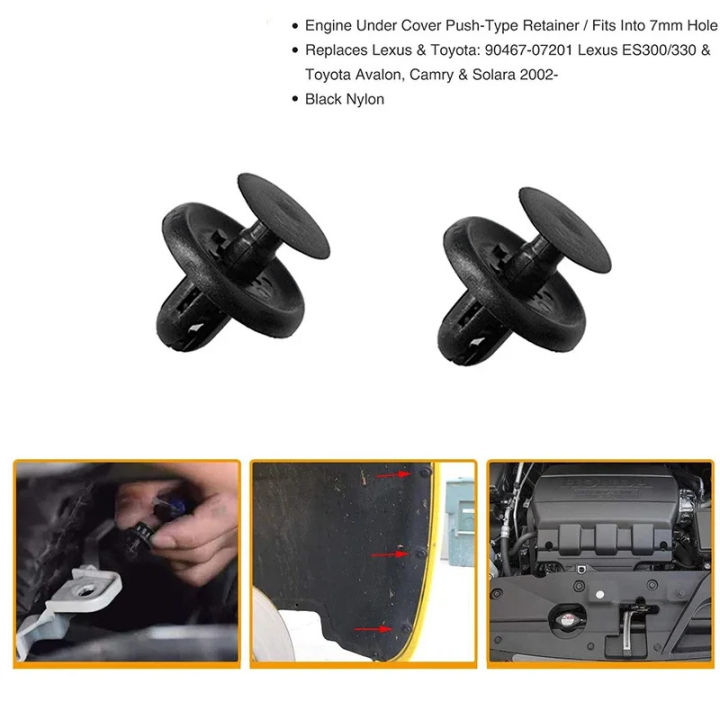 Hast du auch schon mal diese lästigen Plastikclips an deinem Auto verloren oder kaputt gemacht? Mit diesen 100 Ersatzclips bist du für alle Fälle gewappnet! Perfekt für Toyota Modelle wie Corolla, Yaris, Prius, RAV4 und viele mehr - auch für Lexus und andere Marken geeignet.\n\nMit 7mm Durchmesser passen sie genau in die originalen Halterungen und ersetzen die originalen Teile 90467-07201. Einfach reinstecken - schon sitzen sie bombenfest! Aus hochwertigem Kunststoff gefertigt, sind sie verschleißfest und langlebig.\n\nSuper praktisch für Reparaturen an Stoßstangen, Unterbodenschalen oder anderen Verkleidungen. Selbst als Anfänger kriegst du die Montage problemlos hin - einfach den alten Clip raus, neuen rein, fertig!\n\nMit 100 Stück im Set hast du genug Vorrat für mehrere Reparaturen oder kannst sie mit Freunden teilen. Nie wieder Ärger mit verlorenen Clips - dein Auto bleibt schön komplett!
