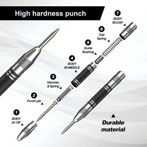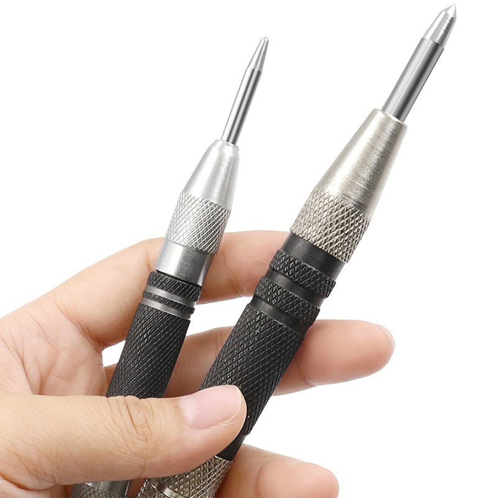 Einfacher geht's nicht: Mit diesen Automatik-Körnern machst du präzise Markierungen ohne Hammer! Einfach draufdrücken - schon setzt die Federkraft den Punkt. Das Set hat 3 Körner (einen mit Kappe, zwei ohne) plus 4 Ersatzspitzen. Aus hartem HSS-Stahl, also langlebig und bruchfest. Der rutschfeste Griff liegt auch mit Handschuhen gut in der Hand. Perfekt für Metall, Holz, Glas - oder im Notfall als Lebensretter zum Einschlagen von Autoscheiben. Dreh die Kappe für mehr oder weniger Schlagkraft. Ob in der Werkstatt, auf der Baustelle oder im Hobbykeller - dieses Tool ist ein echter Alleskönner!