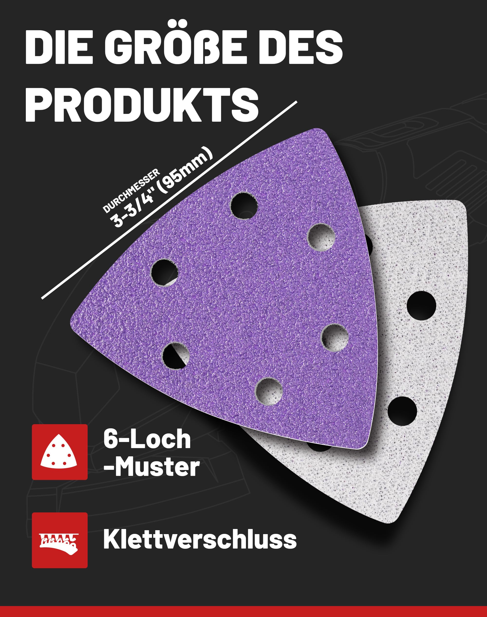 Der 6-Loch-Klettverschluss sorgt für schnellen Wechsel und sicheren Halt. Das wasserfeste Aluminiumoxid-Papier hält auch bei anspruchsvollen Projekten lange durch. Kompatibel mit allen gängigen 93mm Deltaschleifern!