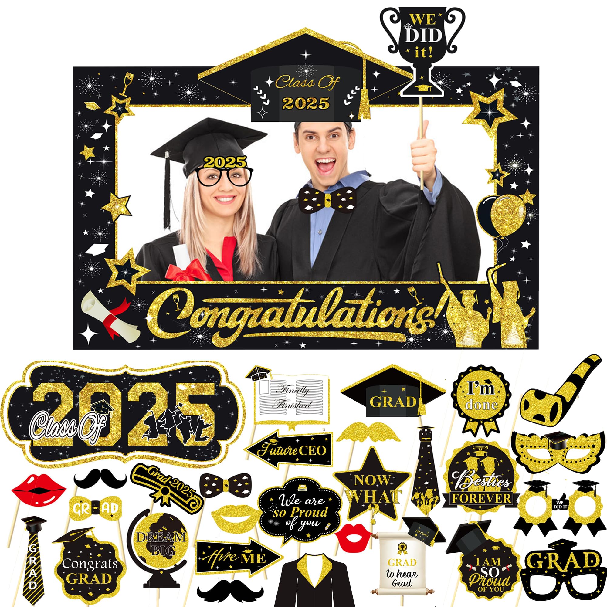 Macht eure Abschlussfeier unvergesslich! Mit diesen 18 golden-schwarzen Partybrillen wird jede Foto-Booth zum Hit. Aus stabilem Glitzer-Karton gefertigt, brechen sie nicht so leicht und sind angenehm zu tragen. Jede Brille hat ein anderes Design mit Motiven wie Abschlusskappen, Herzen, Sternen und Glückwünschen. Perfekt für Jungen, Mädchen, Frauen und Männer - einfach aufsetzen und losposen! Schafft eine fröhliche Atmosphäre und tolle Erinnerungsfotos. Ideal als Geschenk oder für die eigene Feier. Macht einfach Spaß und sieht auf Fotos super aus!