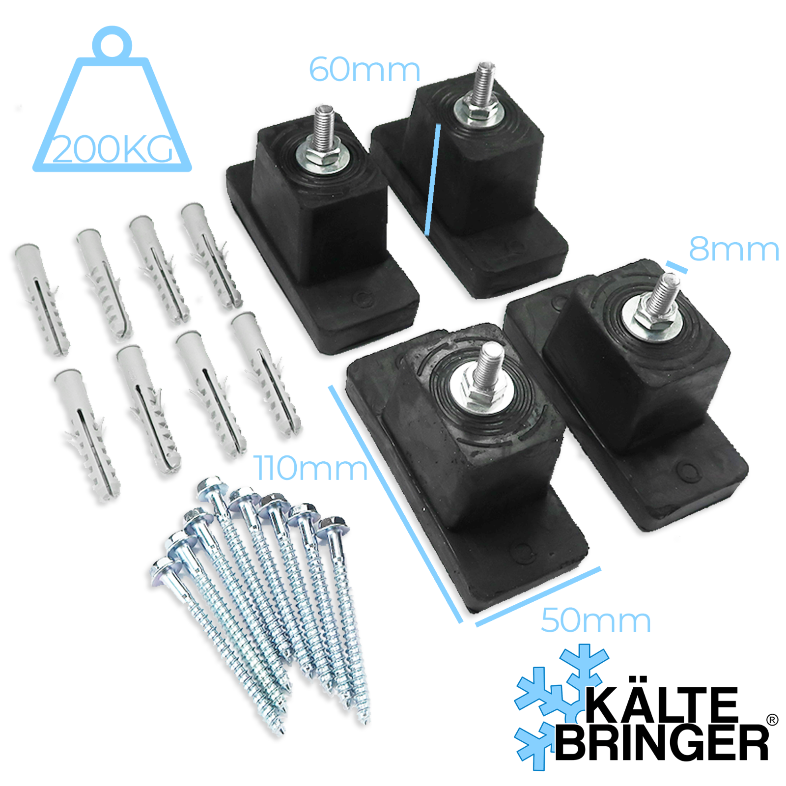 Jeder Dämpfer hält bis zu 500kg aus - zusammen also 2000kg! Maße 10x10cm Basis, 7cm hoch. Mit verzinkten Schrauben für einfache Montage.