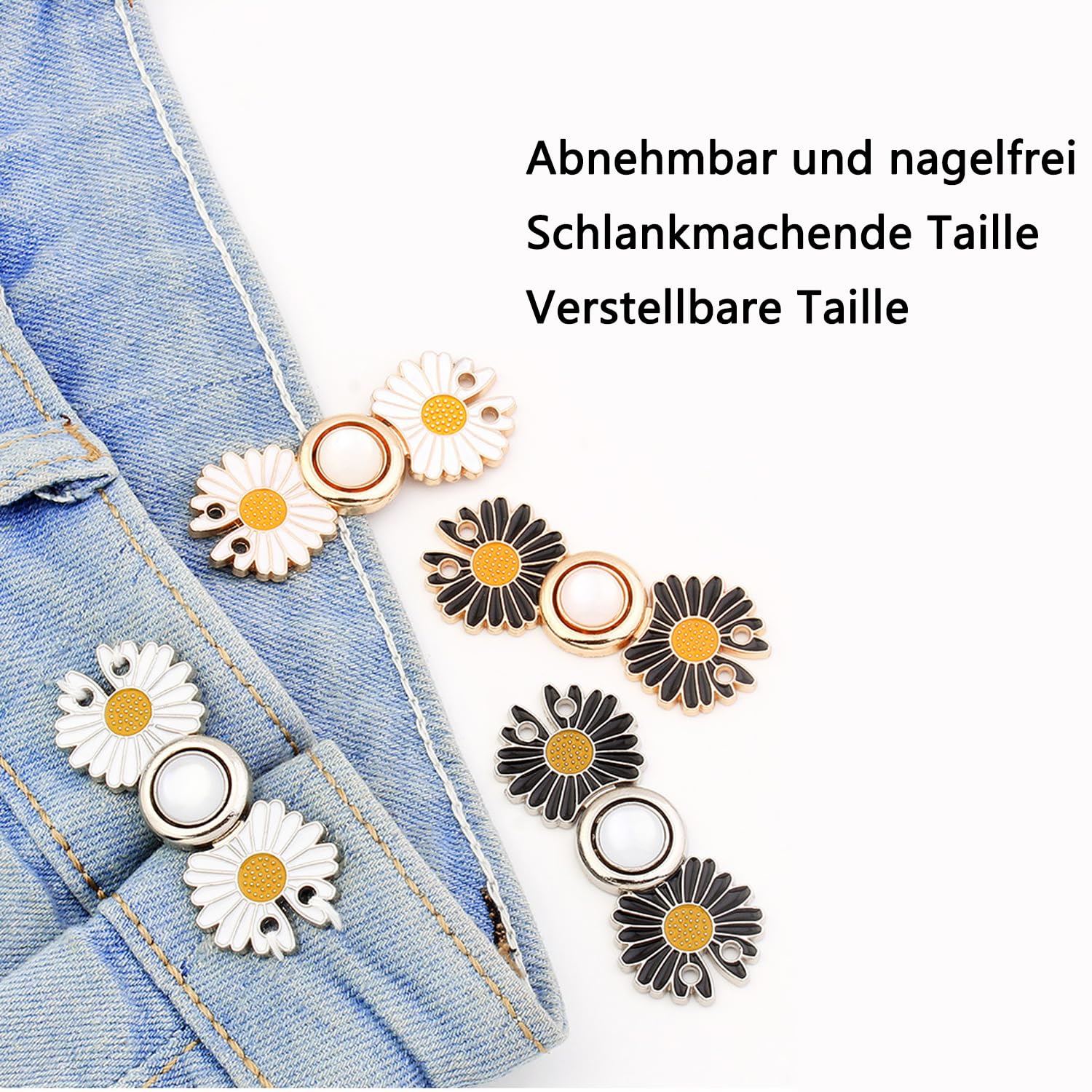 Deine Hose passt nicht mehr perfekt? Kein Problem mit diesen praktischen Hosenclips! Dieses Set mit 5 verschiedenen Designs (Schwarz/Weiß Diamant, Schwarz/Weiß Perle, Kleine Gänseblume) macht deine Hose im Handumdrehen enger - ganz ohne Nähen oder Werkzeuge. Einfach den Clip durch den Hosenbund stecken, zusammendrücken bis es 'klickt' und schon sitzt die Hose wieder wie angegossen. Aus hochwertiger Legierung gefertigt, sind die Clips robust und wiederverwendbar. Perfekt für Jeans, Röcke oder Hosen mit zu weiter Taille. Im Set sind 20 Knöpfe, 20 Basen und 10 Clips enthalten - mehr als genug für mehrere Hosen oder zum Teilen mit Freunden. Einfach, schnell und effektiv - so macht Anpassen Spaß! Auch super als Geschenk für alle, die ihre Kleidung individuell anpassen wollen.