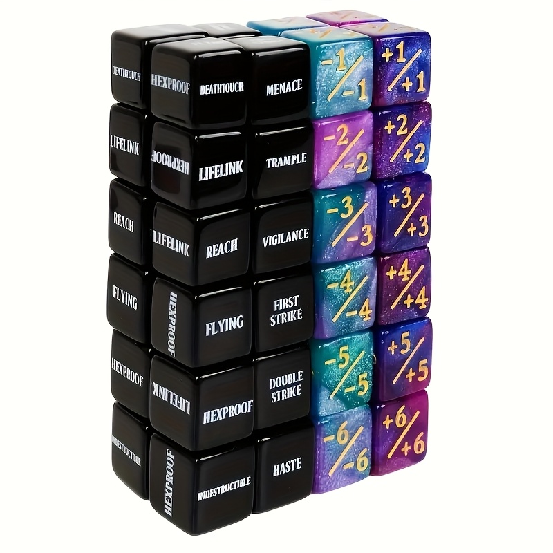 Alles was du für dein Magic Game brauchst! Dieses 48-teilige Set enthält Keyword-Würfel für Haste, Fliegen, Trampeln und mehr, plus Zahlenwürfel von +1 bis +6 und -1 bis -6. Aus hochwertigem Polyresin, 16mm Durchmesser - größer und besser lesbar als Standardwürfel. Inklusive 2 Samtbeuteln für sicheren Transport. Perfekt um Lebenspunkte, Mana und Creature-Stats im Blick zu behalten. Mach dein Magic-Spiel organisiert und professionell. Ready for your next game night!
