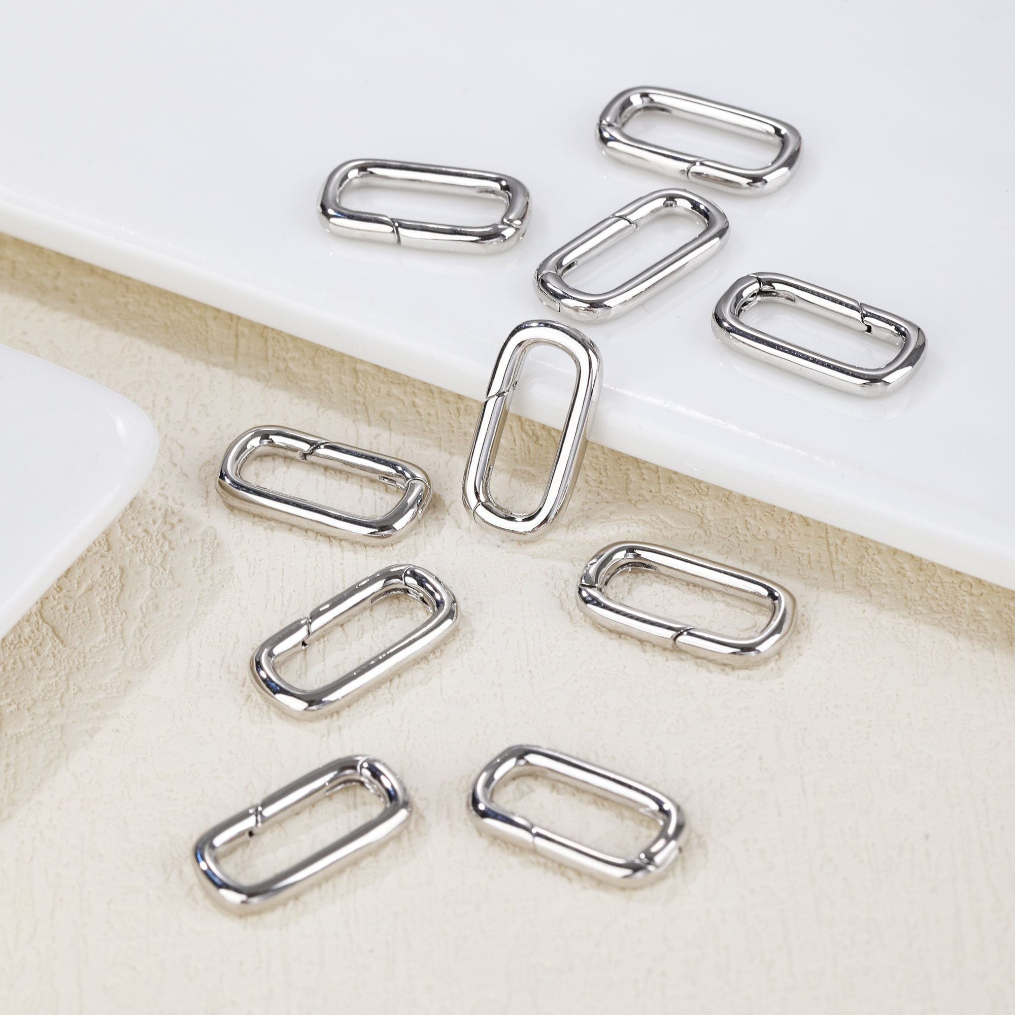 Diese 8 Federtorringe aus Messing sind perfekt für deine Schmuckprojekte! In 2 Farben (je 4 Stück) - 18K vergoldet und platiniert. Ovale Form, 18x9x2,5mm groß. Super für Armbänder, Halsketten oder Anhänger. Die Messing-Qualität ist langlebig und anlaufbeständig. Im Lieferumfang ist sogar ein Silber-Poliertuch (8x8cm) enthalten, um den Glanz zu erhalten. Einfach zu öffnen und schließt sicher. Perfekt für DIY-Schmuck, Bastelprojekte oder Reparaturen. Mit diesen vielseitigen Verschlüssen wird jedes Schmuckstück zum Unikat. Deine Kreativität kennt keine Grenzen!