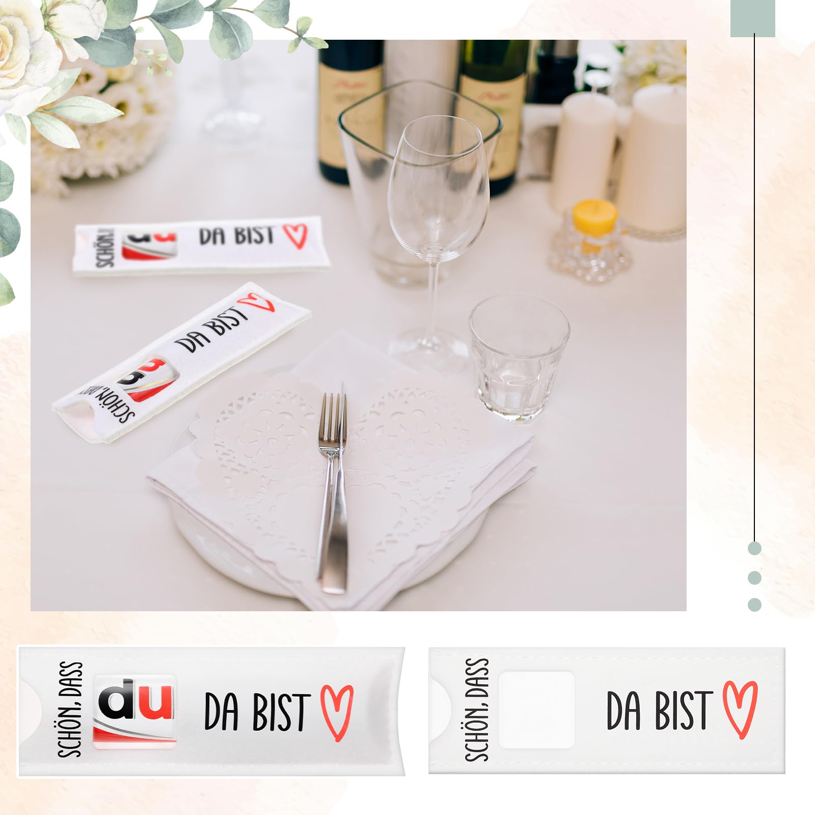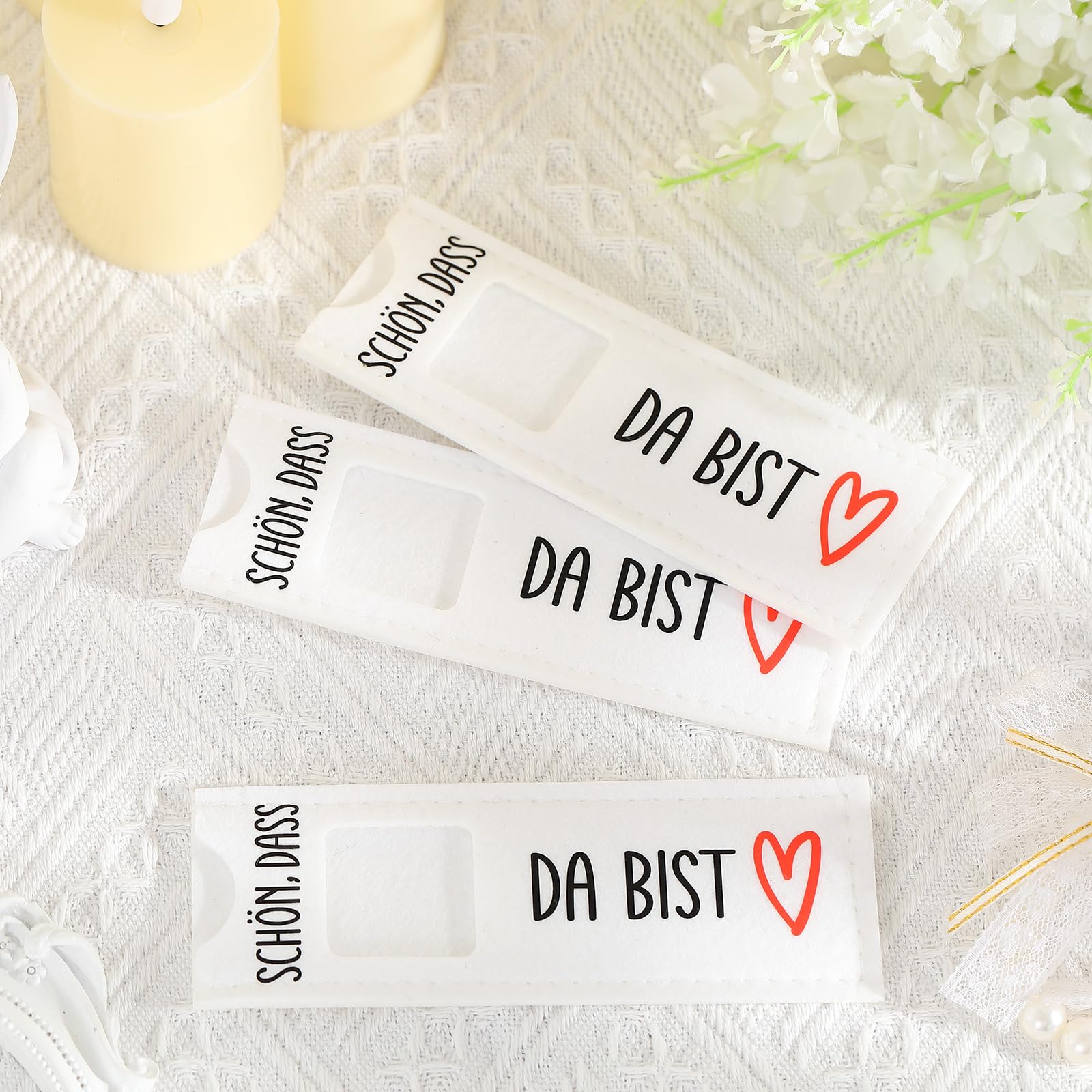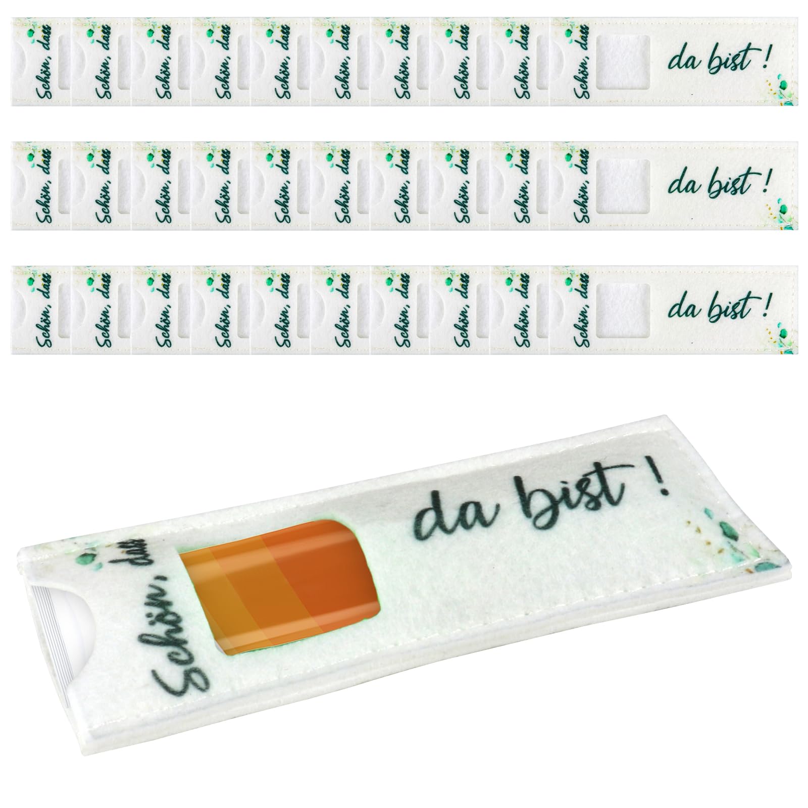 Oh wie süß! Diese Filztaschen mit dem Spruch 'Schön Dass Du Da Bist' sind perfekte Gastgeschenke für besondere Anlässe. Im 15er-Set erhältlich, jeweils 14x5cm groß - genau passend für eine Standard-Schokolade. Aus hochwertigem Filz gefertigt, weich und langlebig, mit hübschem Eukalyptus-Muster verziert. Die Taschen kommen ohne Schokolade, also kannst du sie nach deinem Geschmack befüllen. Perfekt für Taufen, Hochzeiten, Geburtstage oder Firmenfeiern - ein persönliches Dankeschön für deine Gäste! Die Gäste werden sich über diese liebevolle Aufmerksamkeit freuen und die Taschen können später weiterverwendet werden. Einfach befüllen, überreichen und strahlende Gesichter sehen - so macht Schenken Spaß!