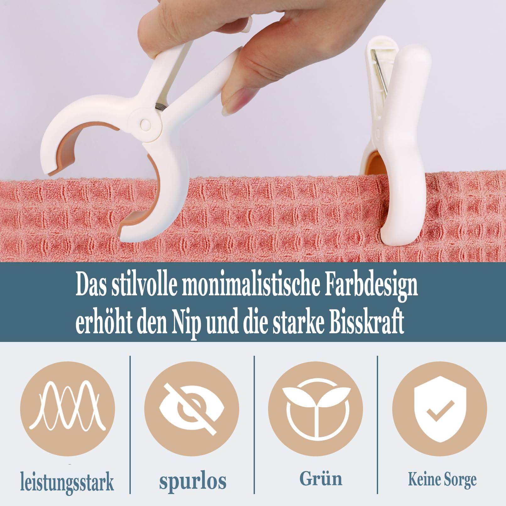 Schluss mit fliegenden Handtüchern am Strand! Diese 8 großen Klammern halten dein Strandtuch auch bei stärkstem Wind sicher auf der Liege fest. Mit 10,6 x 6 x 2,2 cm und einer Öffnung von 6 cm passen sie perfekt um dickere Liegen und Sonnenschirme. Die rutschfesten Rillen sorgen für extra Halt, damit nichts verrutscht. Aus robustem PP-Material, das weder rostet noch bricht - im Gegensatz zu billigen Holz- oder Metallklammern. In fröhlichen Farben: 4x weiß, 2x grün, 2x pink. Super leicht und handlich, nehmen im Strandkorb kaum Platz weg. Nicht nur für Strand und Pool geeignet, sondern auch für Camping, Balkon oder zu Hause für Decken und Bettwäsche. Einfach öffnen, umlegen und dein Handtuch bleibt da, wo es hingehört. Endlich entspannt sonnenbaden, ohne ständig dem Handtuch hinterherzurennen!