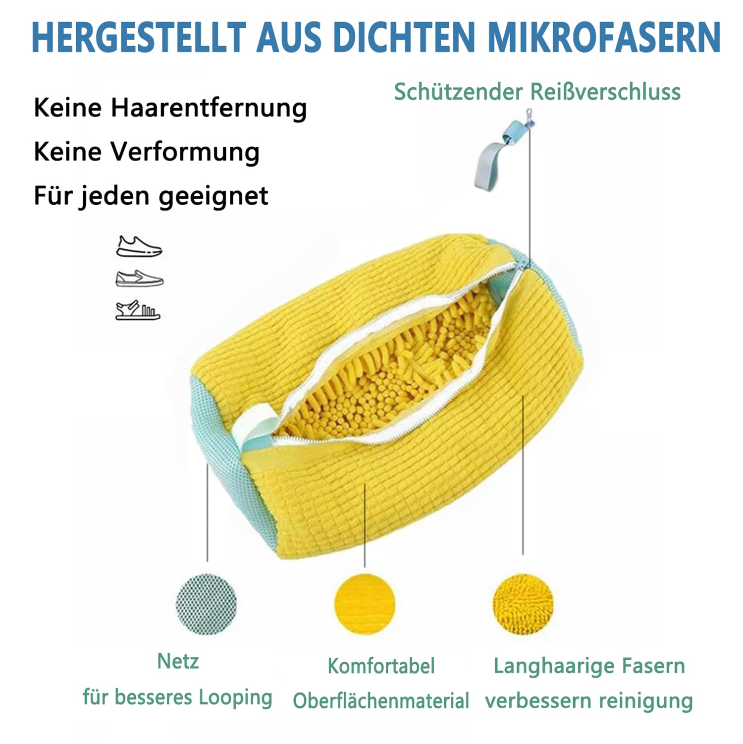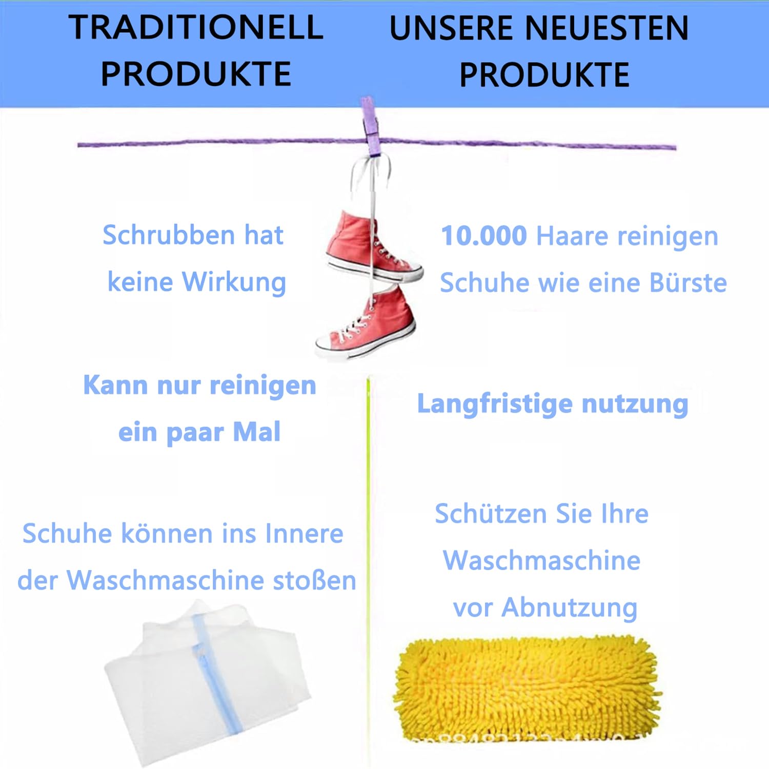 Mit Haken zum Aufhängen - praktisch zum Trocknen. Schützt die Schuhe vor Verfärbungen, Deformierungen und anderen Waschschäden.