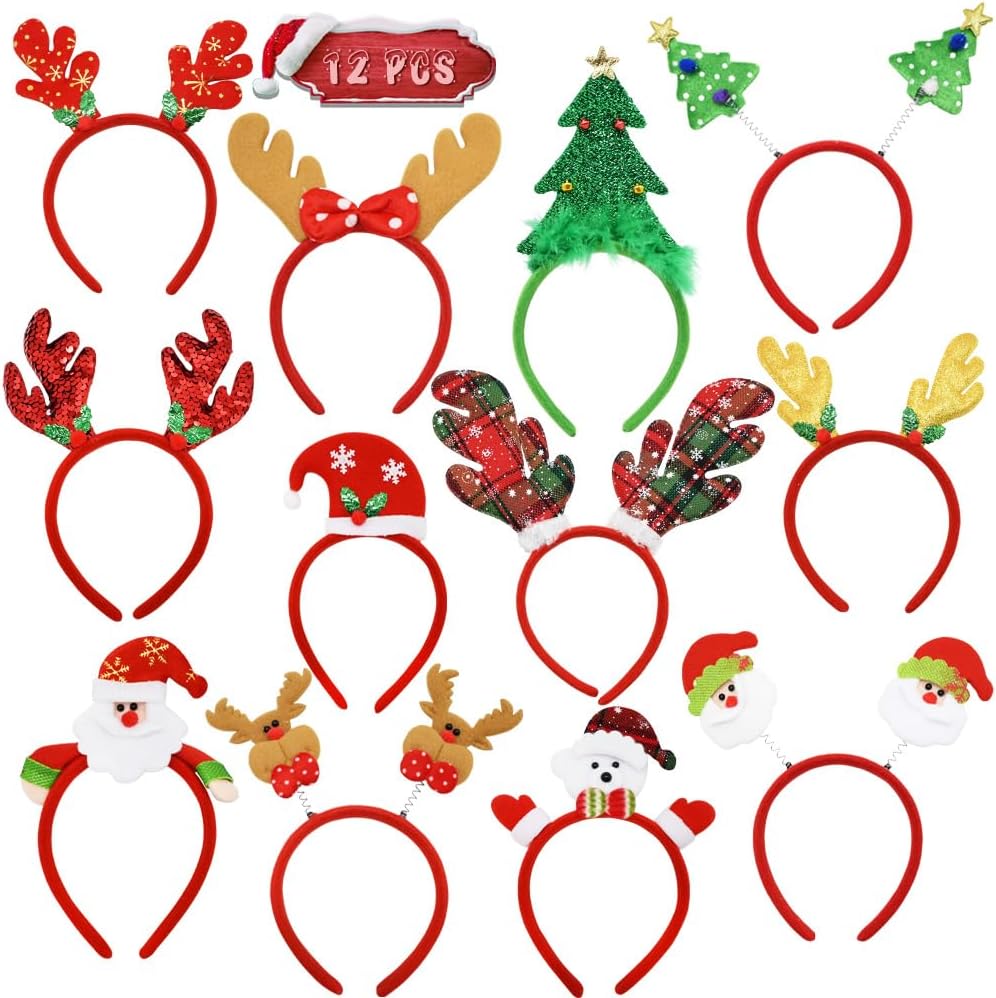 12 Stück Weihnachts Stirnbänder Set - Santa, Rentier, Elfen & Weihnachtsbaum Kopfschmuck