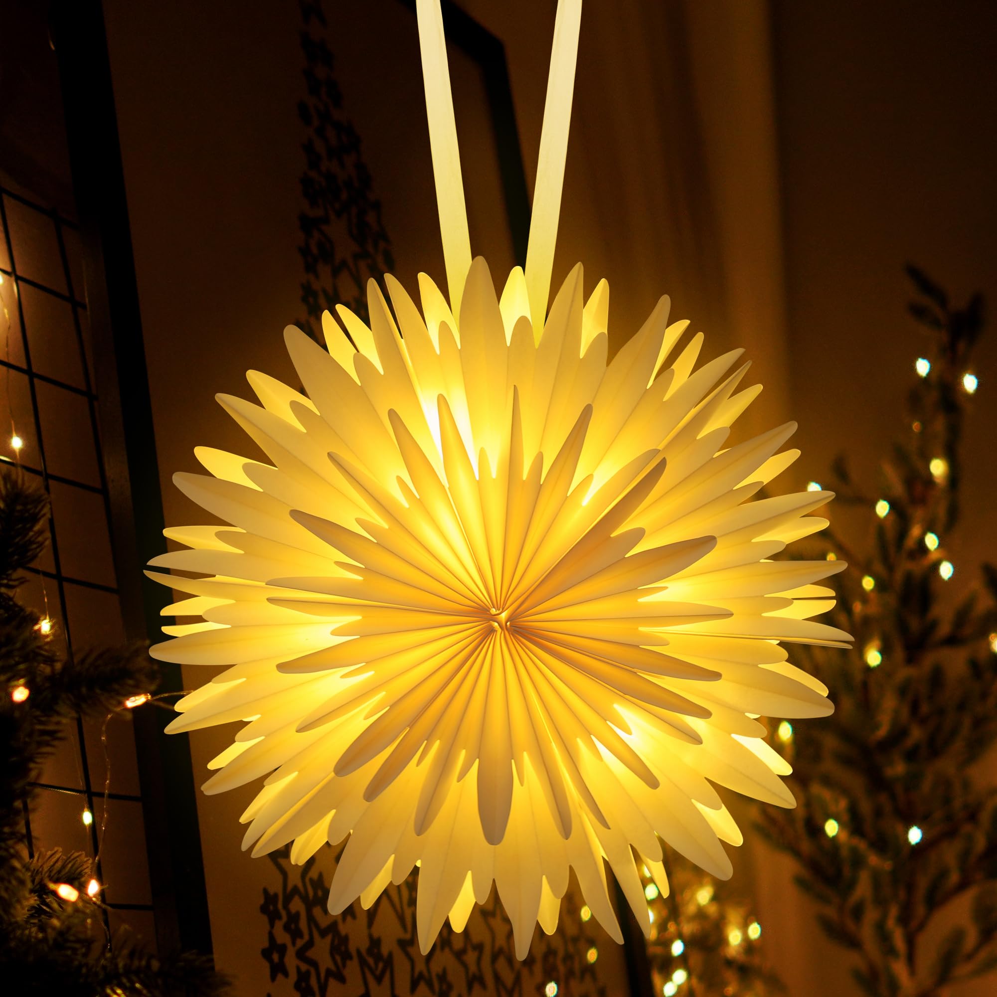 Weihnachtszauber für dein Zuhause! Diese drei beleuchteten Weihnachtssterne in den Größen 35, 45 und 55cm bringen festliche Stimmung in jeden Raum. Aus hochwertigem, umweltfreundlichem Papier gefertigt, sind sie ein echter Hingucker.