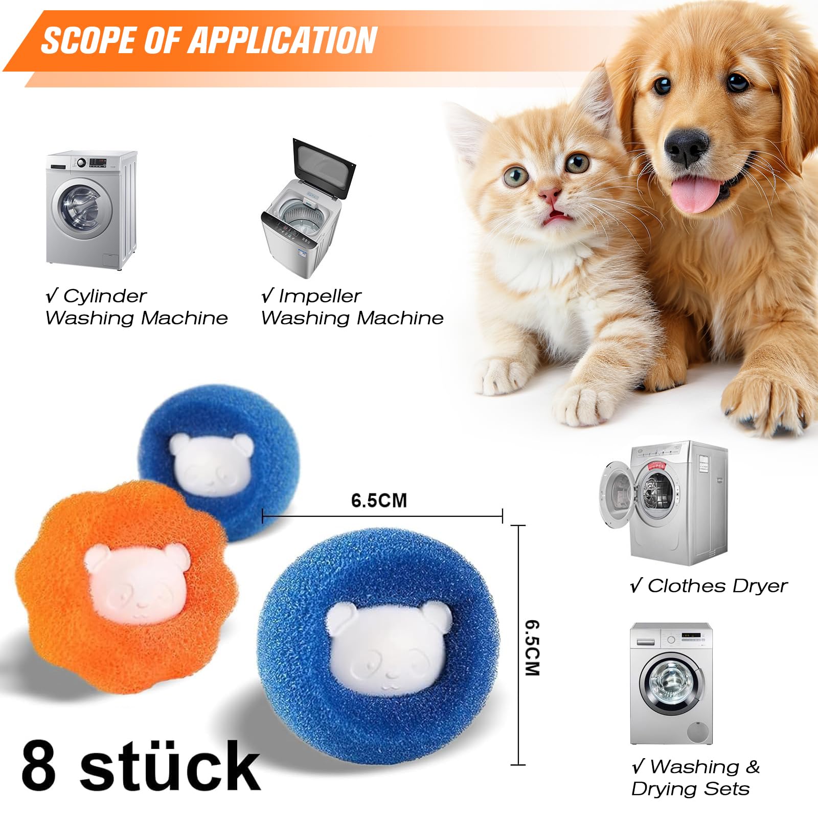 Tierhaarentferner Waschmaschine 8 Stück - Wiederverwendbare Fusselbälle Blau+Orange