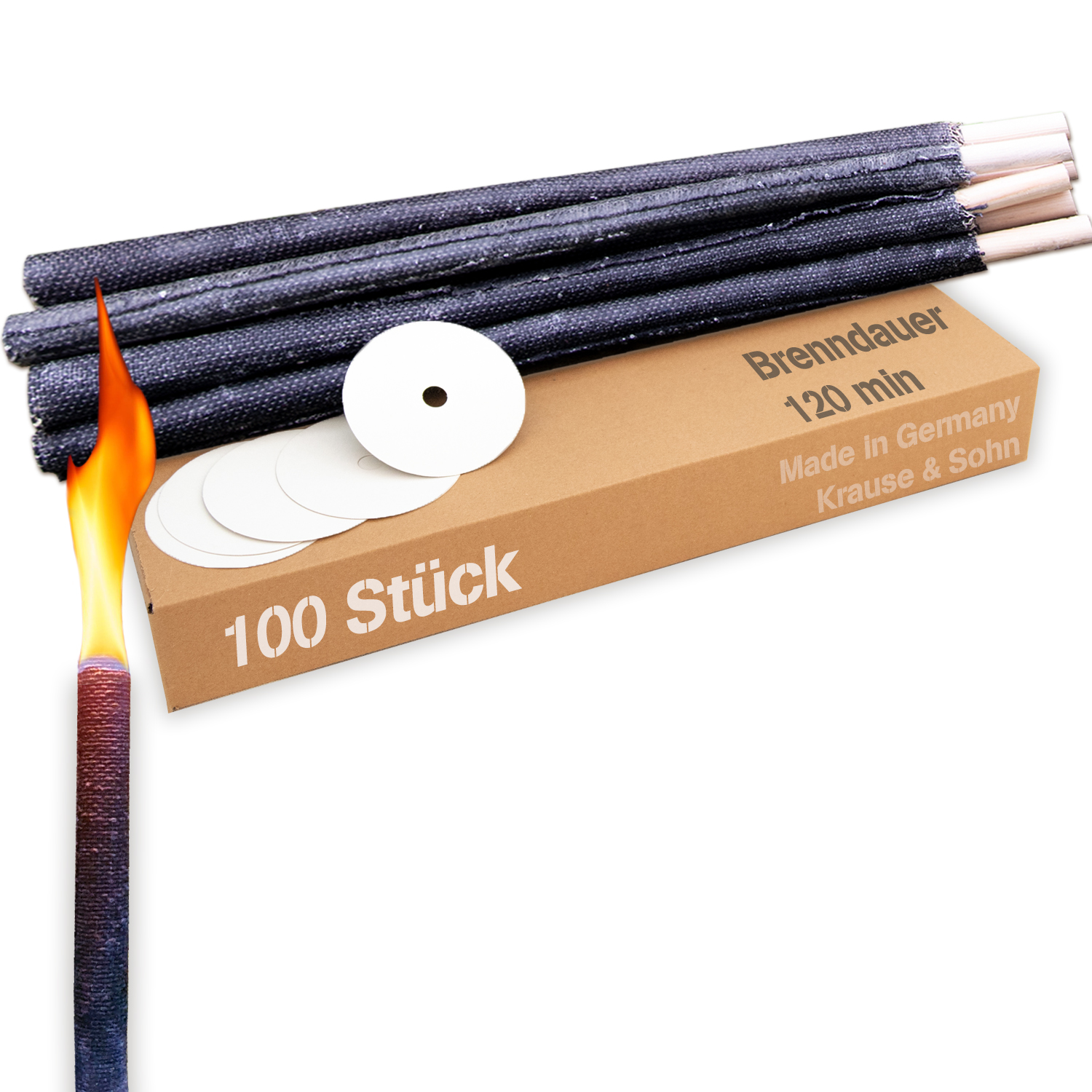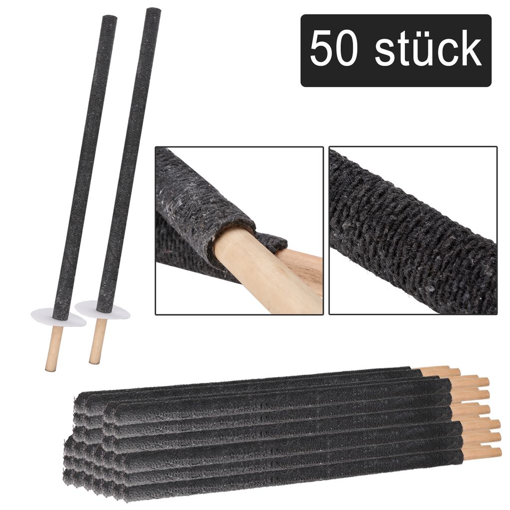 Atmosphäre pur mit diesen Wachsfackeln! Das 50er Set reicht für viele gemütliche Abende am Lagerfeuer oder spannende Nachtwanderungen. Jede Fackel brennt bis zu 100 Minuten.\n\nDer extra lange 12cm Holzgriff liegt gut in der Hand und lässt sich einfach in den Boden stecken. Mit Tropfschutz für sichere Handhabung. Gleichmäßige Flamme ohne Rußbildung - keine lästigen Spritzfunken!\n\nPerfekt für Gartenpartys, Camping oder Weihnachtsmarkt-Stimmung. Schafft sofort eine gemütliche Atmosphäre. Einfach anzuzünden und sicher im Gebrauch.\n• Inhalt: 50 Fackeln + 50 Tropfschützer\n• Brenndauer: ca. 100 Minuten pro Fackel\n• Gesamtlänge: 72cm (60cm Brennkörper + 12cm Griff)\n• Material: Baumwolle mit Wachs\n• Für: Garten, Camping, Nachtwanderungen\n• Sicherheit: Gleichmäßige Flamme, kein Ruß