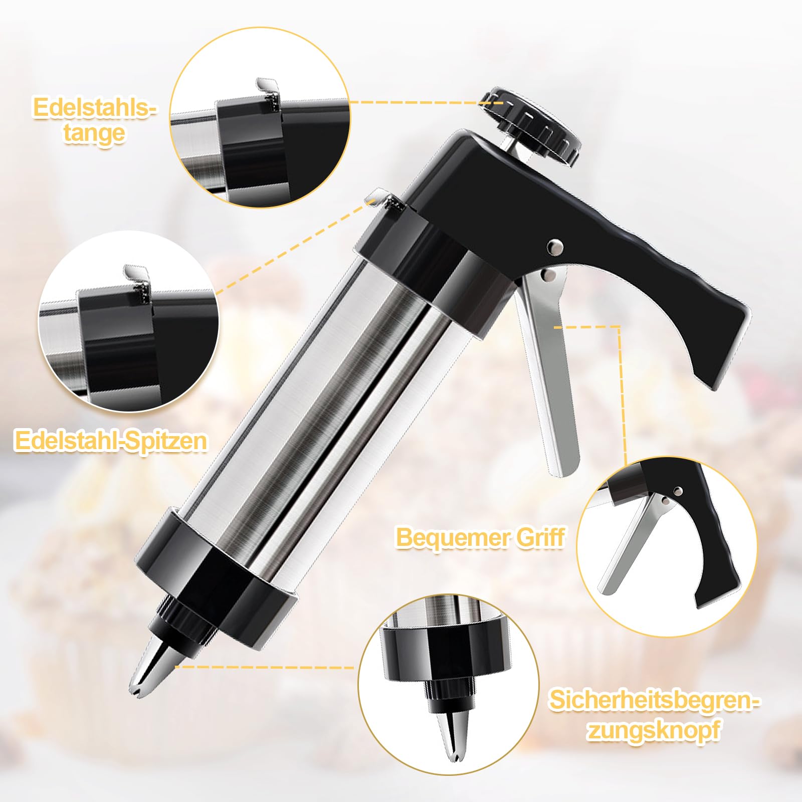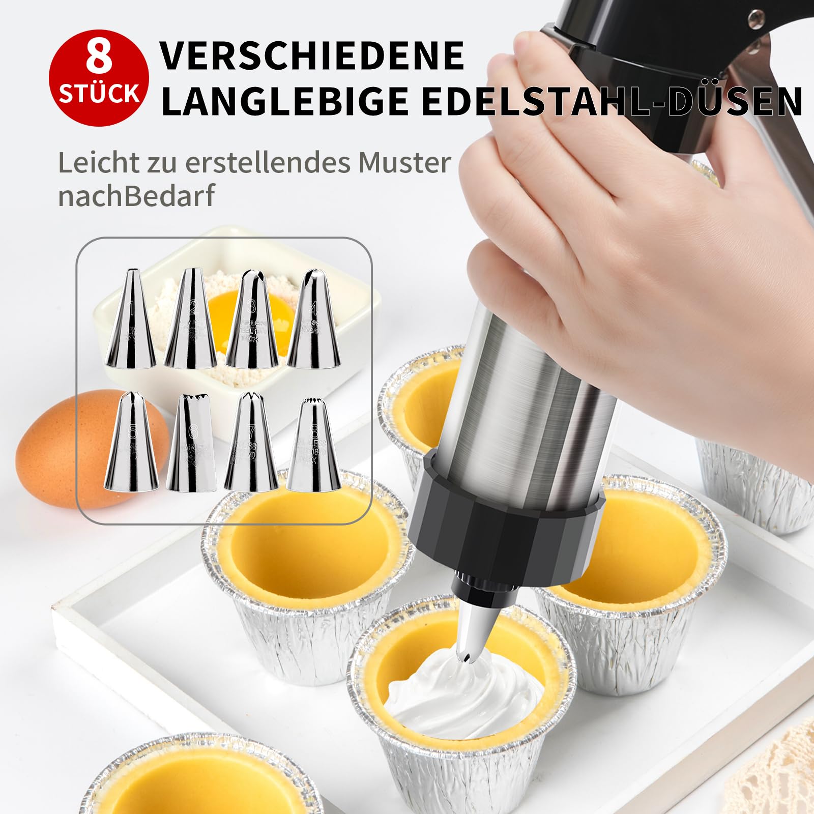 Mega Back-Set! Diese Homelyxe Gebäckpresse aus Edelstahl bringt richtig Spaß in deine Küche. Mit 13 verschiedenen Schablonen und 8 Tüllen kannst du die verrücktesten Kekse und Torten-Dekos machen. Alles aus robustem Edelstahl und ABS-Kunststoff - riecht nach nix und ist super langlebig. Der Griff liegt gut in der Hand und du brauchst nicht viel Kraft zum Drücken. Einfach Teig rein, gewünschte Form drauf und lospressen! Auch für Back-Anfänger super easy zu bedienen. Nach dem Backen geht die Reinigung ratzfatz - alle Teile sind spülmaschinenfest. Wichtig: Drück die Kekse direkt aufs Backblech, nicht auf Backpapier - sonst lösen sie sich nicht gut! Du kannst damit nicht nur süße Kekse machen, sondern auch deftige Sachen wie Pommes-Formen oder frittierte Teigstangen. Dekorieren von Torten und Desserts wird zum Kinderspiel! Perfekt für Partys, Feiern oder einfach wenn du mal was Besonderes backen willst. Mit diesem Set wirst du zum Back-Profi und kannst deine Gäste richtig beeindrucken. Hol es dir und entdeck deine kreative Ader!