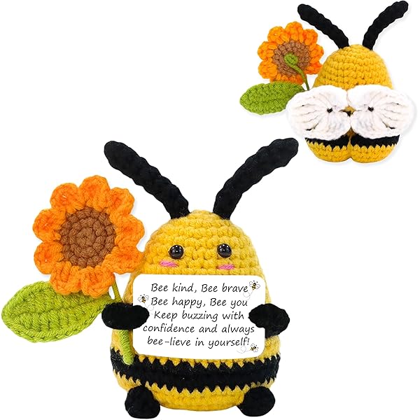 So süß! Diese handgestrickte Pocket Hug Biene ist der perfekte kleine Motivationsbringer. Nur 8cm groß passt sie in jede Tasche oder macht sich super auf dem Schreibtisch. Aus weichem Baumwollgarn gefertigt - hautfreundlich und kuschelig. Mit dabei: eine Karte mit positiven Aufmunterungsworten wie 'Bee Positive!' und 'You will BEE AWESOME!'. Ideal als Glücksbringer für Prüfungen, als Mutmacher für schwere Tage oder einfach als niedliches Geschenk. Perfekt für Kinder, Freunde, Kollegen oder dich selbst. Bringt sofort ein Lächeln ins Gesicht und erinnert daran, positiv zu bleiben!