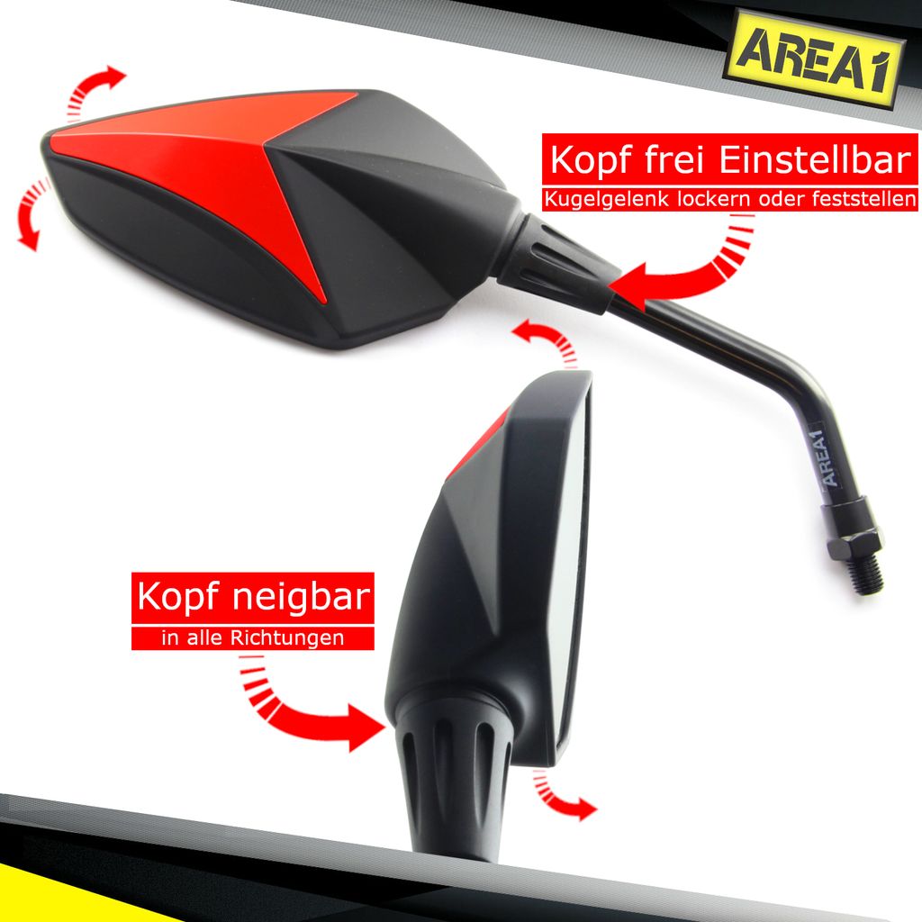 Bring Style auf deine Maschine! Dieses coole Area1 Rückspiegel-Set gibt deinem Motorroller oder Motorrad sofort einen modernen, sportlichen Look. Die kantigen Spiegel mit CNC-gefrästen Armen und Metallkappe (erhältlich in verschiedenen Farben) sind ein echter Hingucker. Das Beste: Sie sind E-geprüft, benötigen also keine extra TÜV-Eintragung und sind sofort straßenzugelassen! Der Spiegelkopf lässt sich mit Kugelgelenk um 360° drehen, der Arm ist zusätzlich neigbar - so findest du immer den perfekten Blickwinkel. Mit ca. 8,7x15cm Spiegelfläche hast du beste Sicht nach hinten. Das 10mm Rechtsgewinde passt für die meisten Großroller über 50ccm und Motorräder. Im Lieferumfang sind 5 verschiedene Adapter enthalten - für 8mm Rechtsgewinde (Piaggio, Vespa, Aprilia), 8mm Linksgewinde (Yamaha, Keeway) und 10mm Linksgewinde für manche Aprilia und Yamaha Modelle. Achtung bei Peugeot, Piaggio und Vespa: Bitte Gewindelänge prüfen, manchmal wird längere Schraube benötigt! Area1 Qualität mit 2 Jahren Garantie - deutscher Support inklusive!