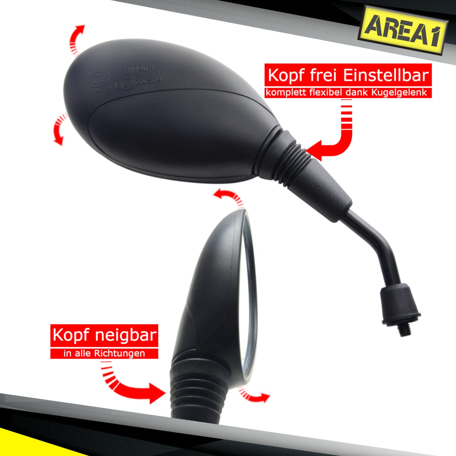Willst du deinen Motorroller oder dein Motorrad aufwerten? Dieses coole Area1 Rückspiegel-Set im sportlichen F1-Design ist genau das Richtige! Kommt als komplettes Set mit 2 Spiegeln (rechts + links). Der Spiegelarm aus lackiertem Stahl mit Area1-Logo und der Spiegelkopf im angesagten Real-Carbon-Look sehen einfach hammer aus! Doppelt verstellbar - sowohl am Spiegelkopf als auch am Arm für optimale Sicht. Mit 10mm Rechtsgewinde und 5 verschiedenen Adaptern für fast alle Motorroller und Motorräder montierbar. Passt für Piaggio, Vespa, Yamaha, Aprilia, Kymco, BMW und viele mehr. Achtung: Ohne E-Prüfzeichen da die Sichtfläche etwas zu klein wäre - aber mega stylisch! Hochwertige deutsche Qualität mit 2 Jahren Austausch-Garantie bei Defekt. Einfache Montage - inklusive detaillierter Anleitung. Mach dein Bike zum echten Hingucker mit diesen sportlichen Spiegeln! Sie sehen nicht nur gut aus, sondern bieten auch praktische Funktionen. Upgrade deine Maschine mit Qualität aus Deutschland!