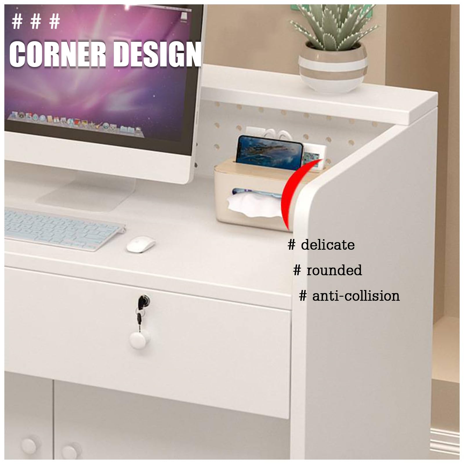 Diese Rezeptionstheke macht jeden Empangsbereich zum Hingucker! Modernes Design in Weiß, aus hochwertiger Dichteplatte gefertigt. Die große Tischplatte bietet viel Platz für Computer, Dokumente und Arbeitsmaterial. Praktische Schubladen mit Schloss für sichere Aufbewahrung von Wertsachen. Versteckte Kabelmanagement-Lösung - keine herumliegenden Kabel mehr! Das Regal bietet extra Stauraum für Taschen oder Drucker. Metallleisten ermöglichen individuelle Gestaltung mit deinem Logo oder Dekoration. Perfekt für Büros, Hotels, Nagelstudios, Kosmetikstudios oder Friseursalons. Einfache Selbstmontage - alles Notwendige ist dabei. Die Theke steht stabil und gibt deinem Business einen professionellen Eindruck. Viel besser als diese langweiligen Standard-Möbel - hier stimmt einfach das Gesamtpaket aus Design und Funktionalität!