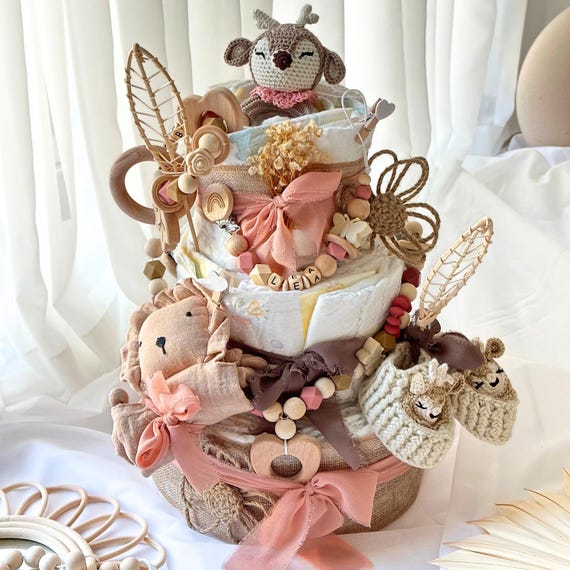 Oh wie süß! Diese Windeltorte von MomsStory ist das perfekte Geschenk für frischgebackene Eltern. Sieht nicht nur super niedlich aus in rosa-weiß, sondern ist auch mega praktisch! Enthalten sind 30 Pampers Windeln in Größe 3 (andere Größen auf Wunsch), plus ganz viele nützliche Baby-Artikel wie Spucktuch, Lätzchen, Schnuller, Mützchen und Pflegeprodukte. Alles ist liebevoll von Hand zu einer tollen Torte arrangiert, die etwa 28 cm hoch wird. In durchsichtiger Folie verpackt und mit hübscher Schleife - einfach direkt verschenkfertig! Perfekt zur Geburt, Taufe oder Babyshower-Party. Die Eltern werden sich riesig freuen, denn sie kriegen nicht nur ein hübsches Geschenk, sondern auch viele nützliche Dinge für den Baby-Alltag. Ein Geschenk, das wirklich ankommt!