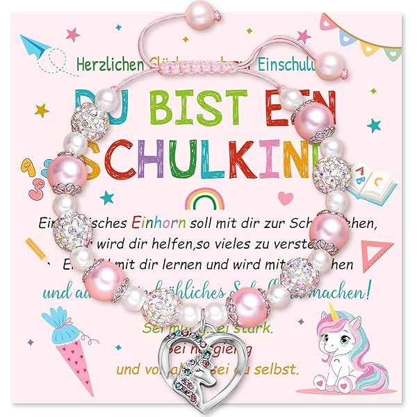 Die Einschulung ist ein ganz besonderer Tag - und dieses niedliche Einhorn Halskettchen macht ihn noch schöner! Das Geschenk-Set enthält eine wunderschöne Halskette in Mondform mit funkelnden Kristallen und einer persönlichen Glückwunschkarte speziell für Schulanfänger. Alles kommt in einer hübschen Geschenkbox verpackt - perfekt zum Überreichen. Die Halskette ist aus hochwertigem, leichten Material, riecht nicht und ist absolut kindgerecht. Sie liegt angenehm am Hals und das Einhorn-Motiv kommt bei kleinen Mädchen super an. Ob als Hauptgeschenk zur Einschulung oder als süße Zugabe für die Schultüte - damit machst du jedem Mädchen eine Freude. Die Karte mit den aufmunternden Worten gibt zusätzlich Mut für den neuen Lebensabschnitt. Ein Geschenk, das nicht nur schön aussieht, sondern auch emotionalen Wert hat. Perfekt für die kleine Prinzessin an ihrem großen Tag!