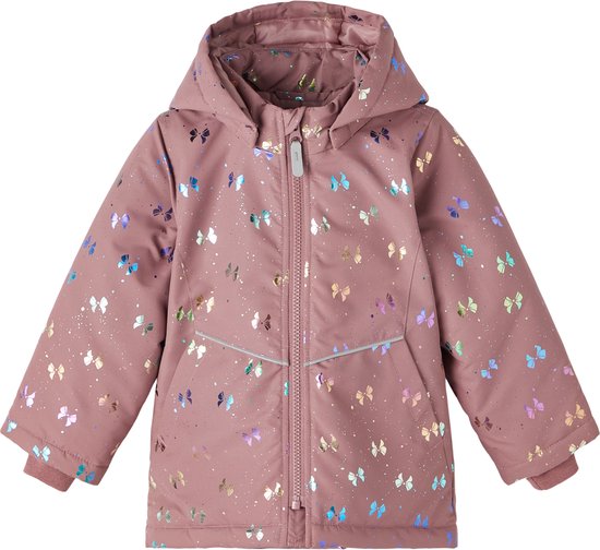 Oh wie süß! Diese NAME IT Jacke für Mädchen ist der absolute Hit für den Herbst. In knalligem Lila mit coolem Allover-Print - da wird deine kleine Fashionista zum Hingucker!\\n\\nMit praktischer abnehmbarer Kapuze und reflektierenden Details für mehr Sicherheit in der dunklen Jahreszeit. Die gerippten Ärmelbündchen und der Reißverschluss mit weichem Kinnschutz sorgen für maximalen Komfort.\\n\\nBesonders praktisch: Die Jacke ist ECO wasserabweisend behandelt - ganz ohne schädliche PFAS! Das bedeutet, sie hält nicht nur trocken, sondern ist auch noch umweltfreundlich.\\n\\nMit seitlichen Taschen für kleine Schätze und elastischer Taille für perfekten Sitz. Hinten etwas länger geschnitten für extra Schutz. Einfach anziehen und los geht's - perfekt für Kindergarten, Spielplatz oder Familienausflüge!