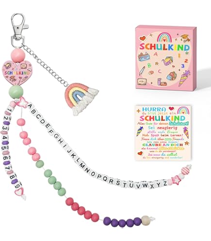 Oh, was für ein süßes Geschenk zur Einschulung! Perfekt für kleine ABC-Schützen. Mit einer bunten Rechenkette mit 3 Seilen: Eins mit \SCHULKIND\, eins mit ABC-Buchstaben und eins mit 20 Perlen zum Rechnen lernen. In einer hübschen Geschenkbox mit niedlichen Motiven. Inklusive Grußkarte mit lieben Wünschen für den Schulstart. Die Rechenkette kann am Rucksack befestigt werden - immer dabei! Fördert spielerisch das Lernen von Buchstaben und Zahlen. Achtung: Nicht personalisierbar! Perfekt für den ersten Schultag, Geburtstage oder einfach als Überraschung. Macht jedem Mädchen eine Freude und gibt Mut für den neuen Lebensabschnitt!