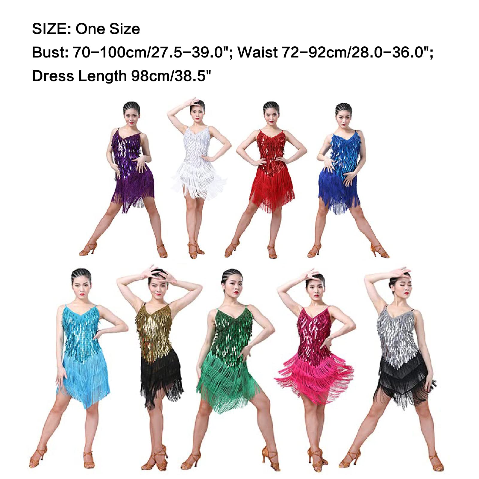 Das Oberteil ist komplett mit funkelnden Pailletten besetzt, der abgestufte Fransenrock sorgt für tolle Bewegungseffekte. Mit Spaghetti-Trägern und V-Ausschnitt sitzt das Kleid perfekt. Ein weiches Futter macht es angenehm zu tragen. Von Größe 6 bis 16 verfügbar - einfach die Größentabelle checken und die perfekte Passform finden. Handwäsche empfohlen, damit der Glitzer lange hält!