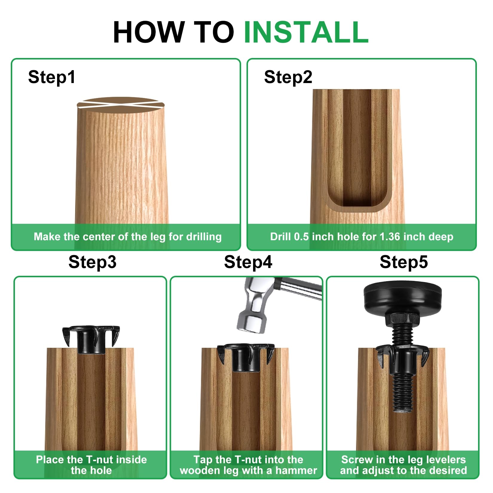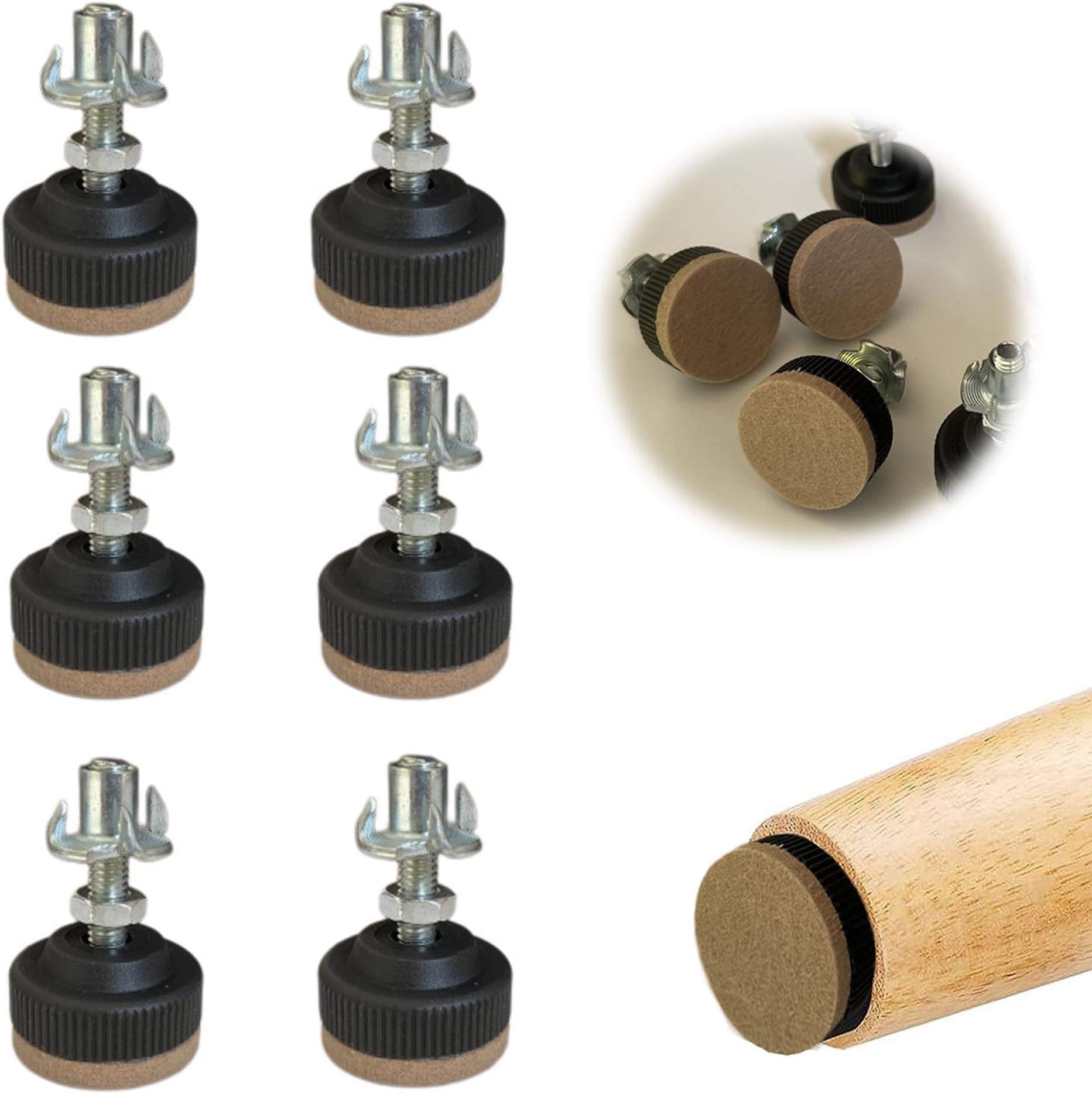 Einfach ein 6mm Loch bohren, die Mutter einschlagen und die Füße reinschrauben. Fertig! Perfekt für Schränke, Tische, Werkbänke, Sofas - eigentlich alles, was Beine hat.