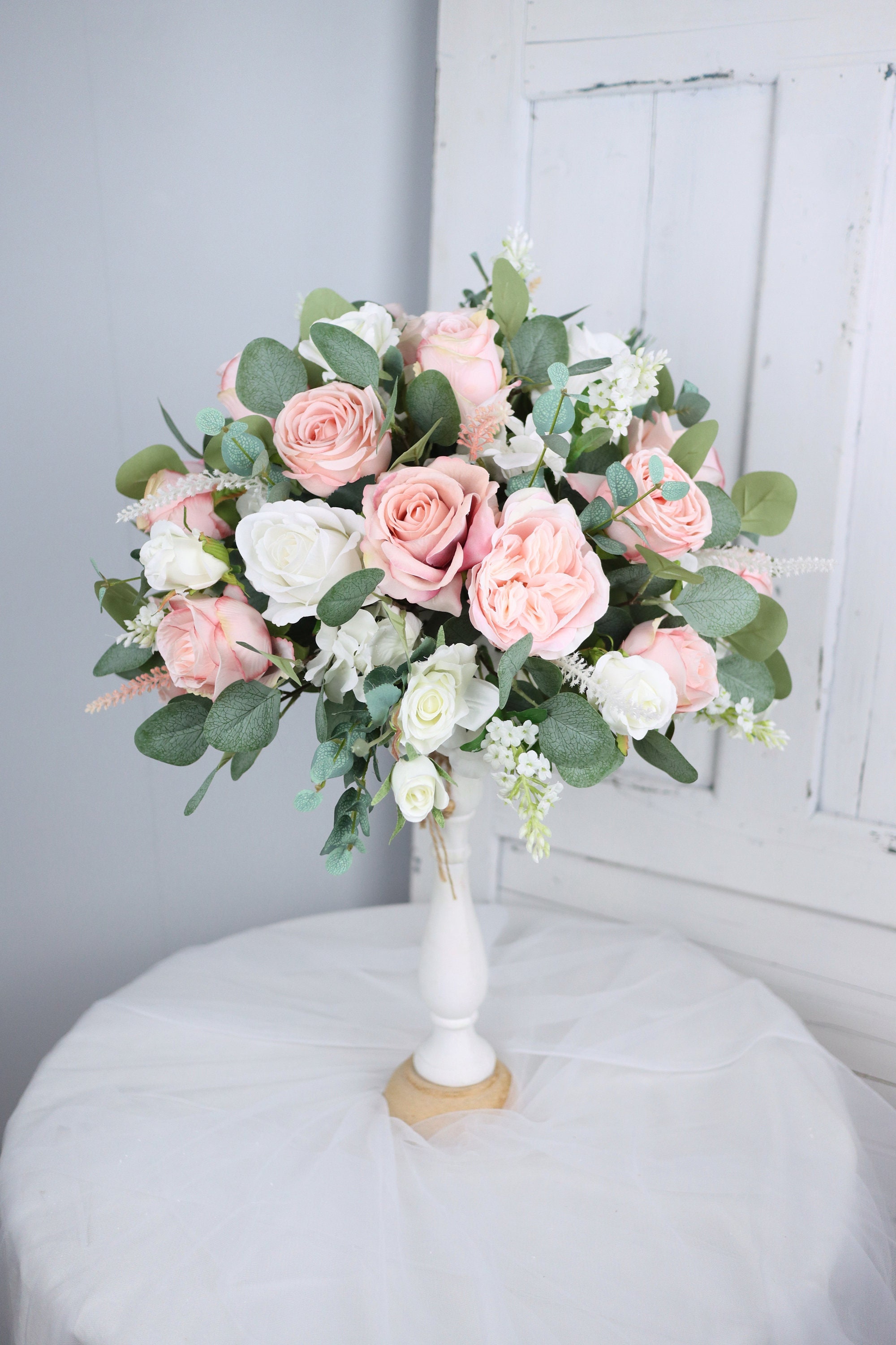 Hochzeitstischarrangement Weiß & Salbeigrün | Blumenkugel 40cm | Künstliche Rosen & Pfingstrosen