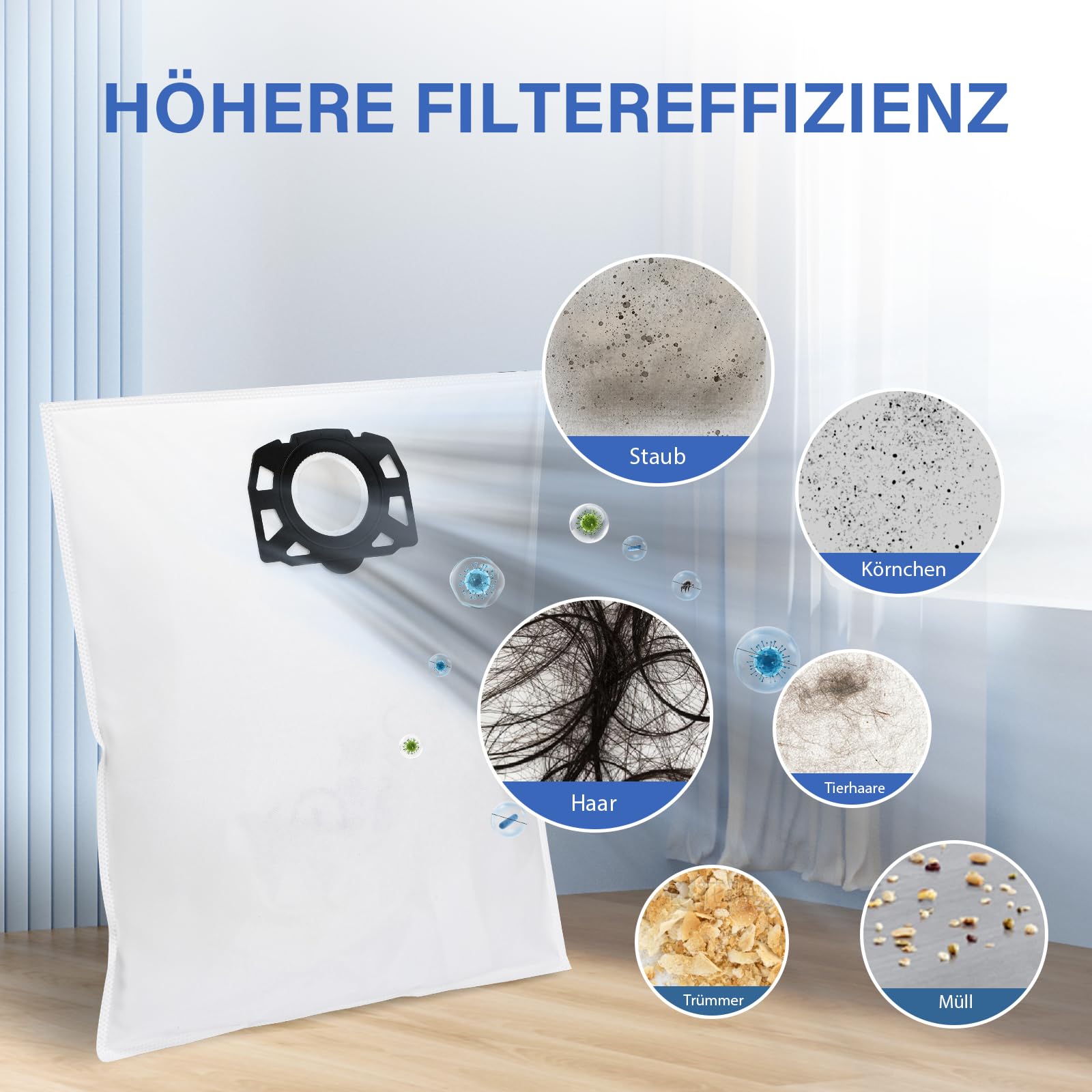 Immer Ersatz parat! Dieses Set mit 12 KFI 487 Staubsaugerbeuteln passt perfekt für Kärcher WD4, WD5, WD6, MV4, MV5, MV6, KNT4 und andere Nass-/Trockensauger. Ersetzt original Kärcher 2.863-006.0 Beutel. Aus hochwirksamem Vliesstoff mit mehrlagigem Filterdesign, das 99,99% der Staubpartikel, Pollen, Haare und Allergene ab 2,5 Mikron zurückhält. Besonders dicht und reißfest - selbst bei nassen oder schweren Partikeln kein Auslaufen oder Reißen. Einfach zu wechseln ohne Werkzeuge, mit hoher Passgenauigkeit. Empfohlen wird monatlicher Wechsel für optimale Saugleistung. Ideal für Haushalt, Büro oder gewerbliche Nutzung - mit 12 Beuteln bist du lange versorgt und sparst Kosten!