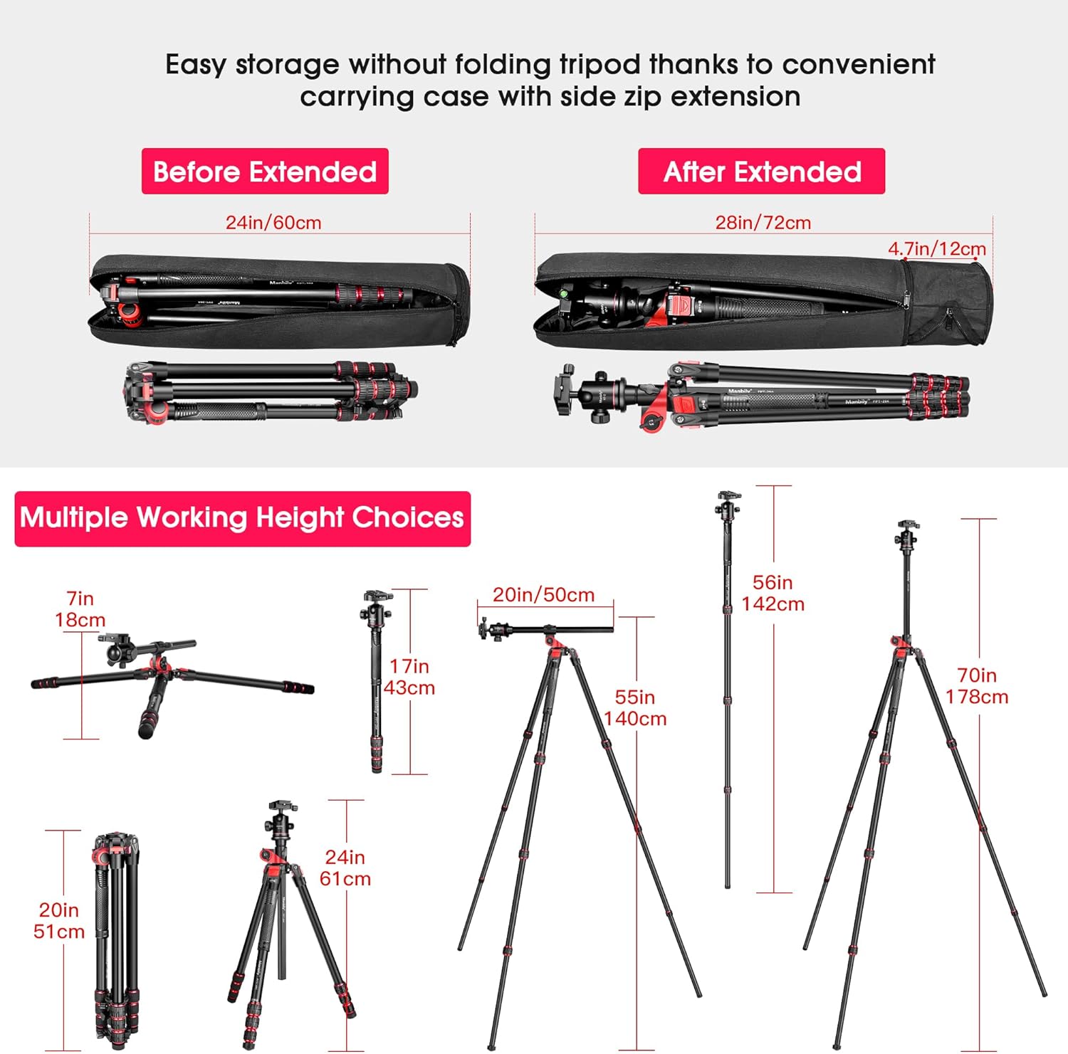 Perfekte Stabilität für deine Foto- und Videoaufnahmen! Der Manbily LR-255 Kameramonopod aus hochwertiger Aluminiumlegierung wächst mit deinen Anforderungen - von kompakten 33,5cm auf volle 108cm Arbeitshöhe. Mit 5 ausziehbaren Segmenten und dem praktischen Drehknopf-Verschluss stellst du die perfekte Höhe blitzschnell ein. Die 1/4-Zoll-Gewindeschraube passt zu den meisten Kameras, Actioncams und sogar Smartphone-Haltern. Bis zu 5kg trägt das robuste Stativ problemlos - ideal für deine DSLR, Systemkamera oder Videokamera. Ob beim Wandern, auf Reisen oder bei Events - der leichte Monopod (nur 339g) ist immer dabei. Das CNC-gefräste Aluminium garantiert maximale Stabilität ohne Verwindungen. Perfekt für scharfe Fotos bei wenig Licht, stabile Videoaufnahmen oder einfach als praktischer Kameraträger. Dein vielseitiger Begleiter für alle fotografischen Abenteuer!