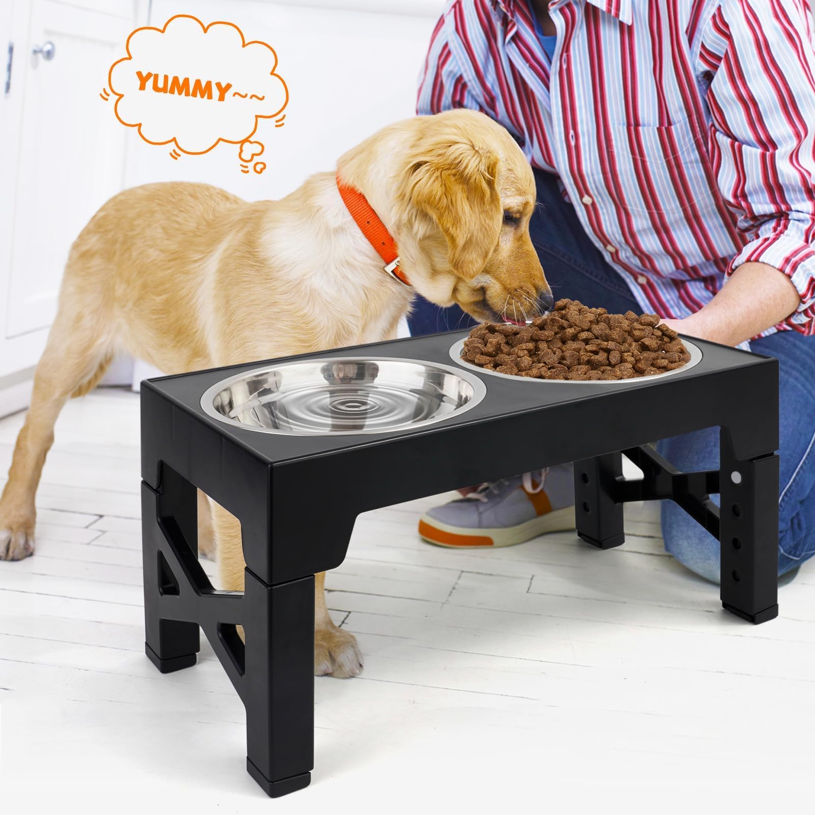 Dieser erhöhte Hundenapf ist ein echter Game-Changer für deinen Vierbeiner! Mit 5-facher Höhenverstellung (von 26,7cm bis 34,7cm in 2cm-Schritten) findest du für jede Hunde-Größe die perfekte Futterposition. Kein lästiges Bücken mehr - das schont Halswirbelsäule und Gelenke deines Hundes. Der stabile ABS-Ständer steht bombenfest, dank rutschfester Füße. Die 4,5cm hohe Schallwand verhindert lästiges Herumspritzen von Futter und Wasser - endlich saubere Futterecken! Die beiden Edelstahl-Näpfe mit 20cm Durchmesser bieten reichlich Platz für Futter und Wasser. Edelstahl ist nicht nur hygienisch, sondern auch spülmaschinenfest und langlebig. Besonders praktisch: Napf und Ständer lassen sich trennen - so wird die Reinigung zum Kinderspiel! Perfekt für große und kleine Hunde, ob Welpe oder Senior. Dein Hund wird's dir danken - und du freust dich über weniger Sauerei in der Wohnung! Einfach ein durchdachtes Produkt das das Füttern für Mensch und Tier angenehmer macht.