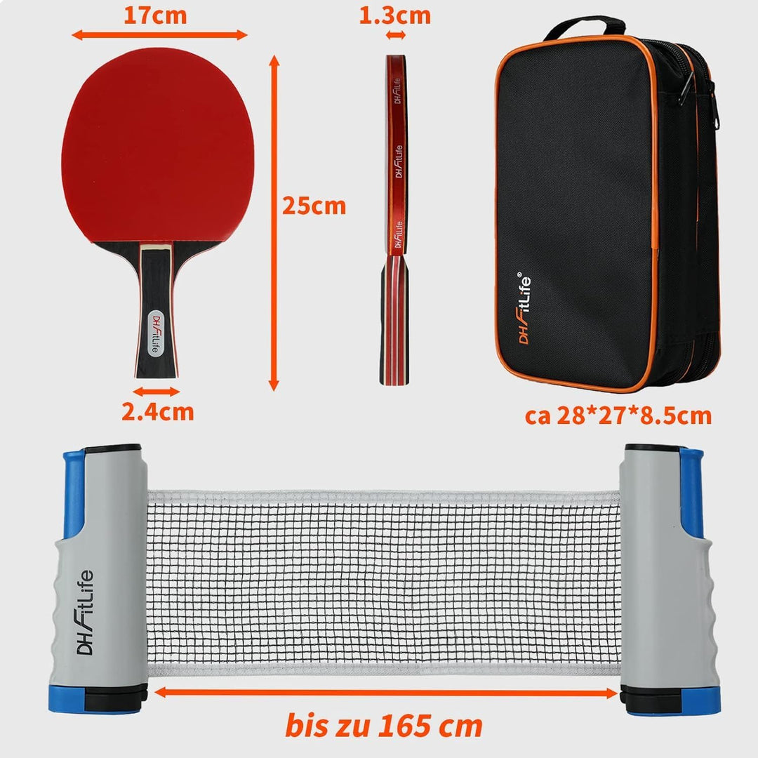 Ping Pong Spaß für jeden Tisch! Dieses komplette Tischtennis-Set von Sporgo hat alles, was du für sofortigen Spielspaß brauchst. Zwei Profi-Schläger mit 7-lagiger Pappelholz-Platte und Carbon-Belag für super Ballkontrolle, plus 4 hochwertige Bälle. Das ausziehbare Netz passt auf jeden Tisch bis 165cm Breite - in 3 Sekunden aufgebaut! Alles verstaut in der praktischen Tasche, perfekt für Garten, Büro oder Urlaub. Die Schläger mit 2mm Schwamm und 0,4mm Gummibelag geben dir das echte Profi-Feeling. Die griffigen Blumenmuster-Hölzer liegen super in der Hand und rutschen nicht. Egal ob du Anfänger oder Fortgeschrittener bist - mit diesem Set machst du garantiert eine gute Figur am Tisch. Für Kinder, Jugendliche, Erwachsene - einfach für alle, die Spaß am schnellsten Rückschlagspiel der Welt haben! Einfach auspacken und losspielen - mehr Brauchst du nicht für den perfekten Spieleabend!